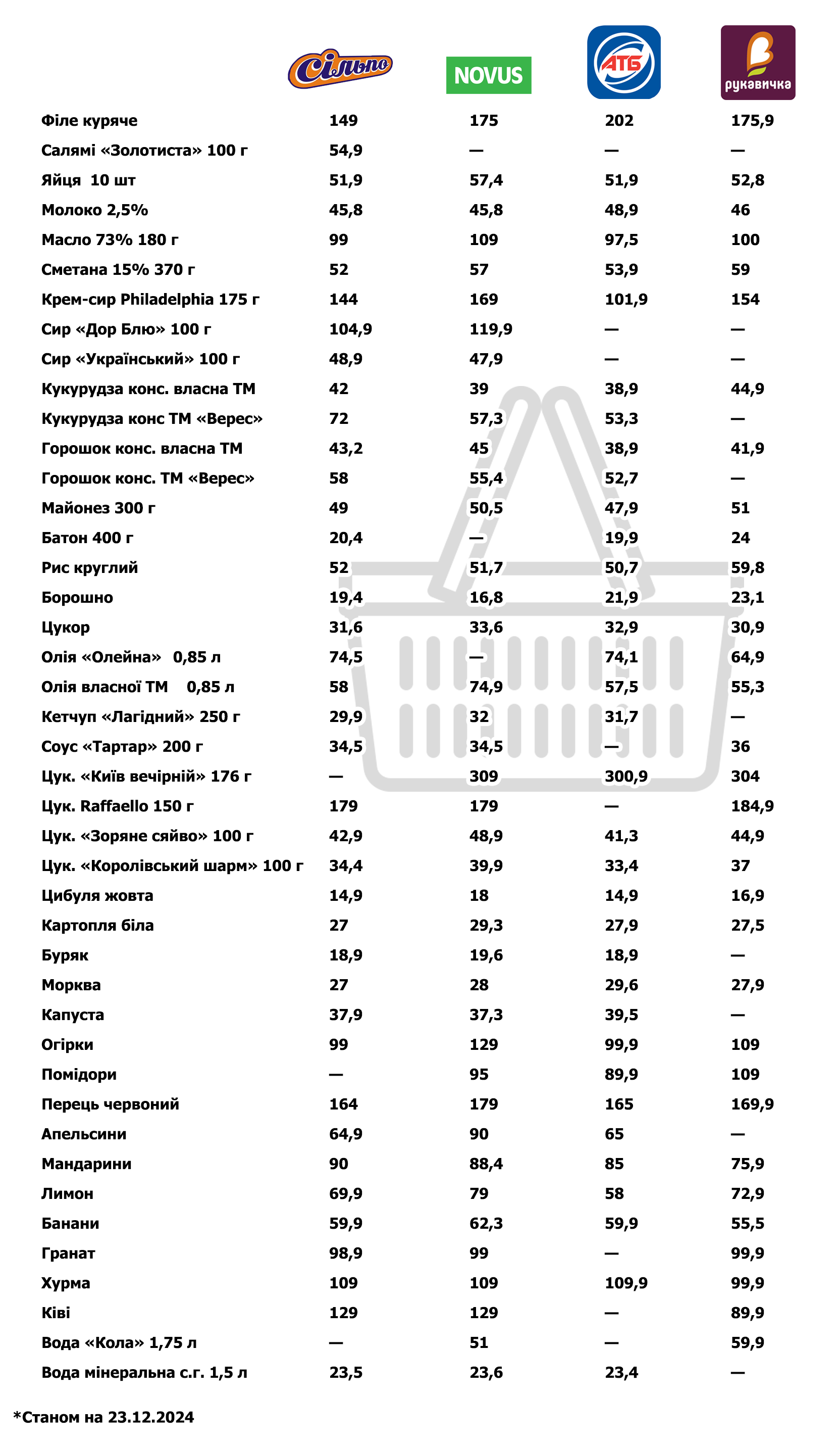 Журналісти «RIA плюс» склали список продуктів та порівняли ціни на них у трьох мережах супермаркетів — «Сільпо», «АТБ», «Рукавичка» та NOVUS. Ми обирали товари від одних виробників, щоб порівняти різницю цін. До прикладу — молочна продукція «Молокія», батон «Агробізнес», консерви ТМ «Верес», майонез «Королівський смак, цукерки «Рошен»і «АВК», кетчуп «Торчин», соус тартар «Щедро» тощо. Також ми обирали найдешевші пропозиції серед овочів та фруктів, круп.