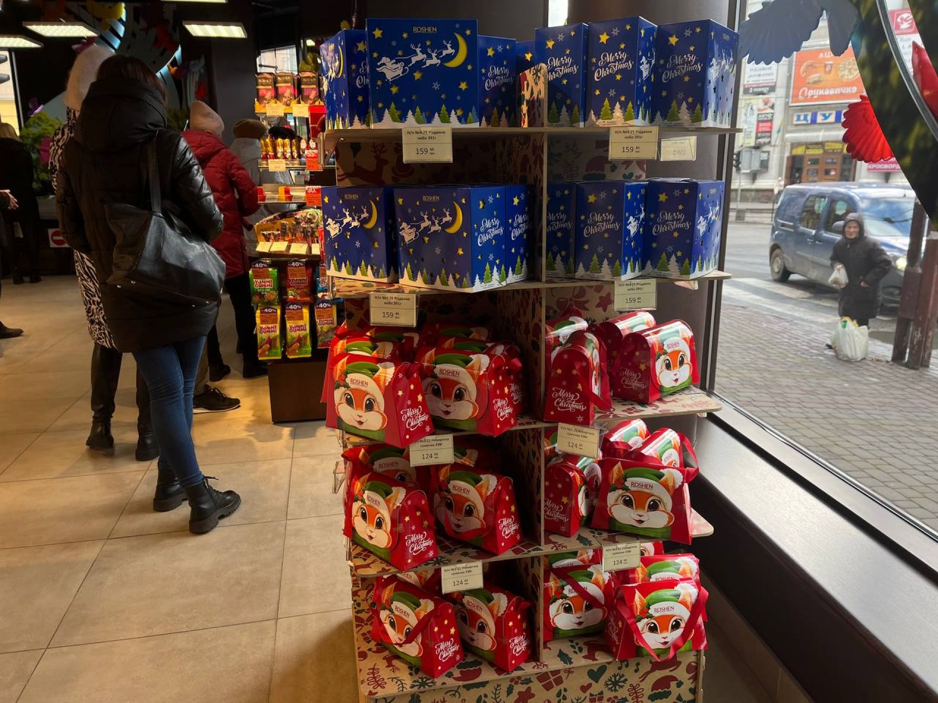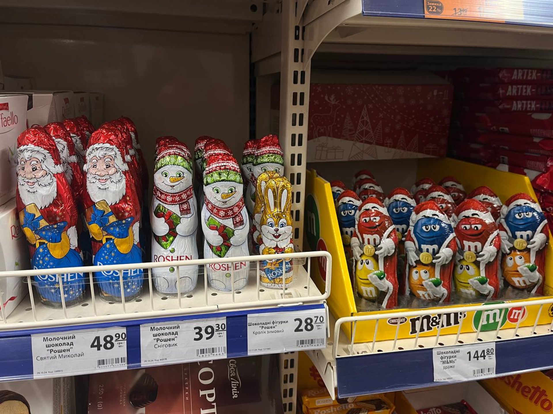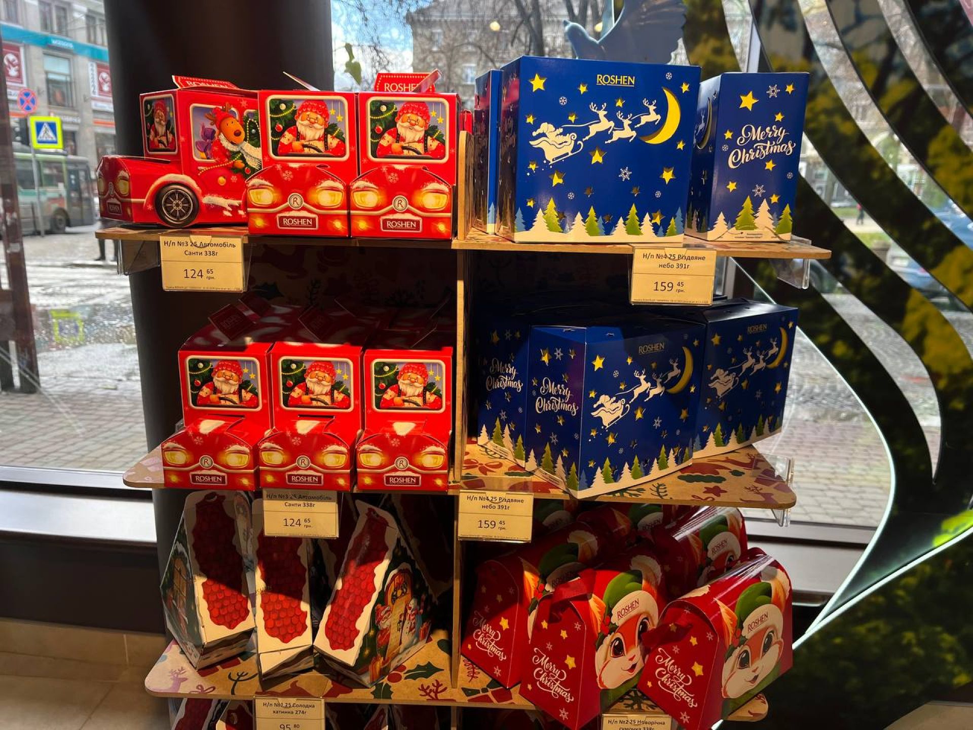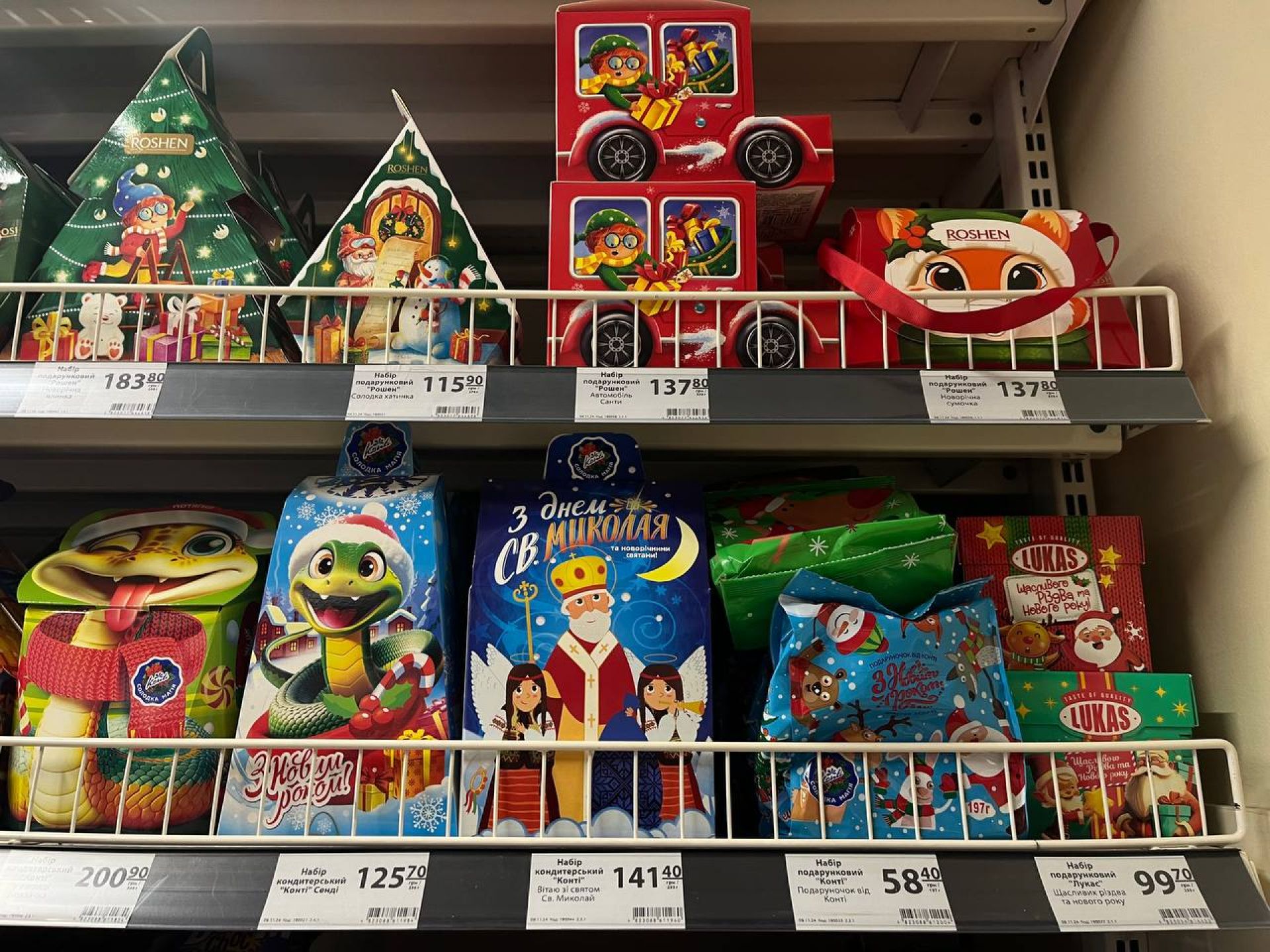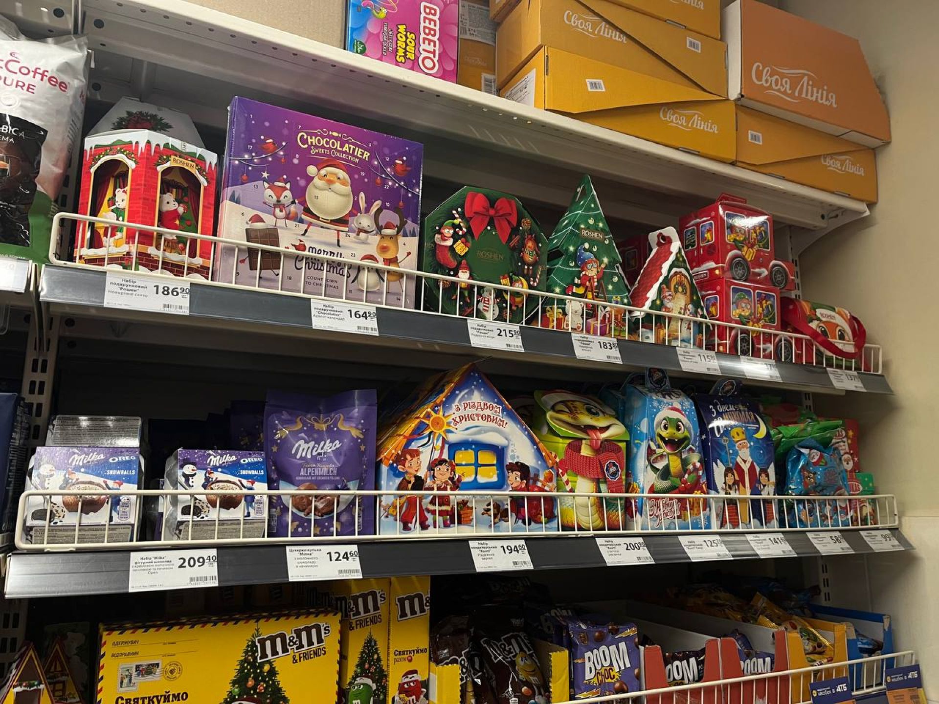 У магазині є чи не найбільша кількість різдвяних солодощів. Вони займають одразу кілька стендів. Всі різної форми, а також на будь-який гаманець. Наприклад: