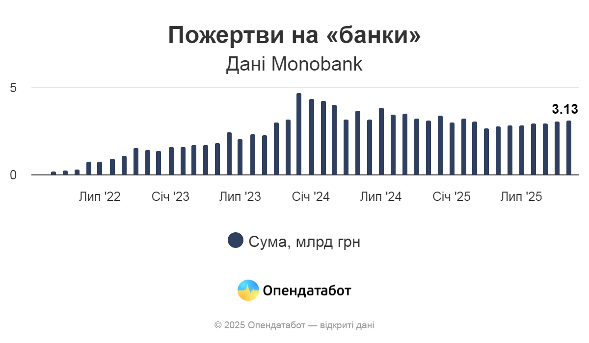 Якщо торік донатів на фонди меншало, натомість пожертви на банки в Mono збирались краще, то у 2025 ситуація змінилась. За рік сума пожертв на банки скоротилась на 19%, натомість фонди зібрали на третину більше, аніж за три попередні роки загалом.