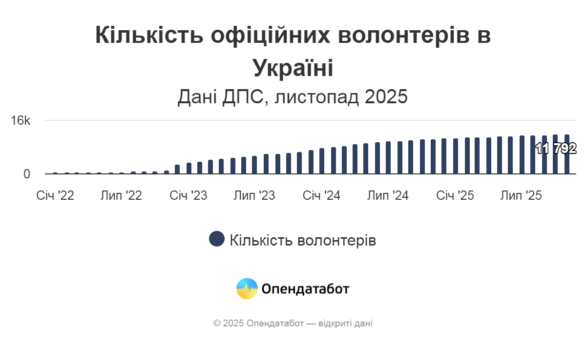 11 792 волонтери станом на початок грудня зареєстровано у відповідному реєстрі ДПС. Офіційних волонтерів в країні менше не стало, хоча поповнюється цей перелік не так активно, як раніше — лише +11% за рік. До порівняння, за весь 2024 рік реєстр виріс у півтора раза. Водночас від початку року з волонтерського переліку виключили 136 людей.
