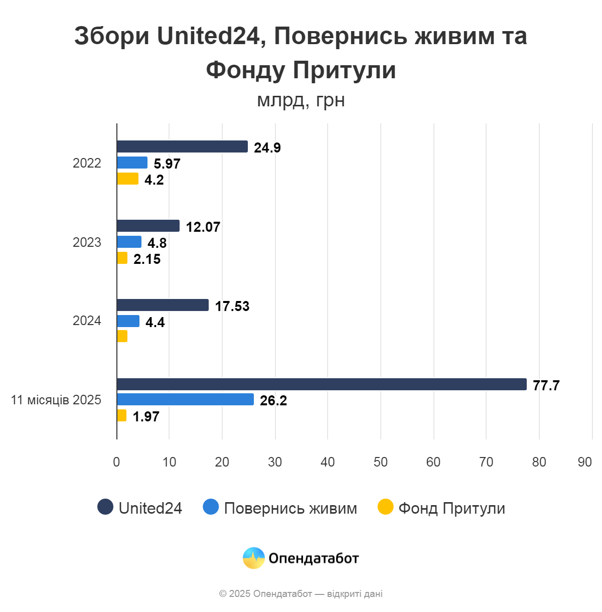 Найуспішнішим місяцем для United2 став жовтень 2025 року: сума пожертв була удвічі більшою, ніж за весь рік до того. Схожа ситуація й у Повернись живим: за місяць на рахунки фонду надійшло 19,7 млрд грн — це більше, ніж за всі 3 попередні роки разом. А от у Фонда Притули рекордним за донатами став листопад: за цей місяць зібрано 310 млн грн, що майже удвічі більше за середньомісячний показник цьогоріч.