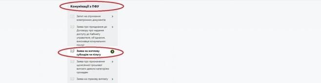 В особистому кабінеті на панелі зліва в розділі «Комунікації з ПФУ» обираємо опцію «Заява на житлову субсидію чи пільгу».
