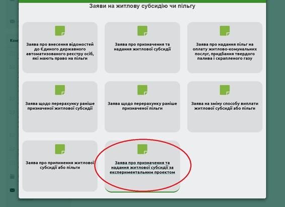- У наступному вікні обираємо опцію «Заява про призначення та надання житлової субсидії за експериментальним проектом».