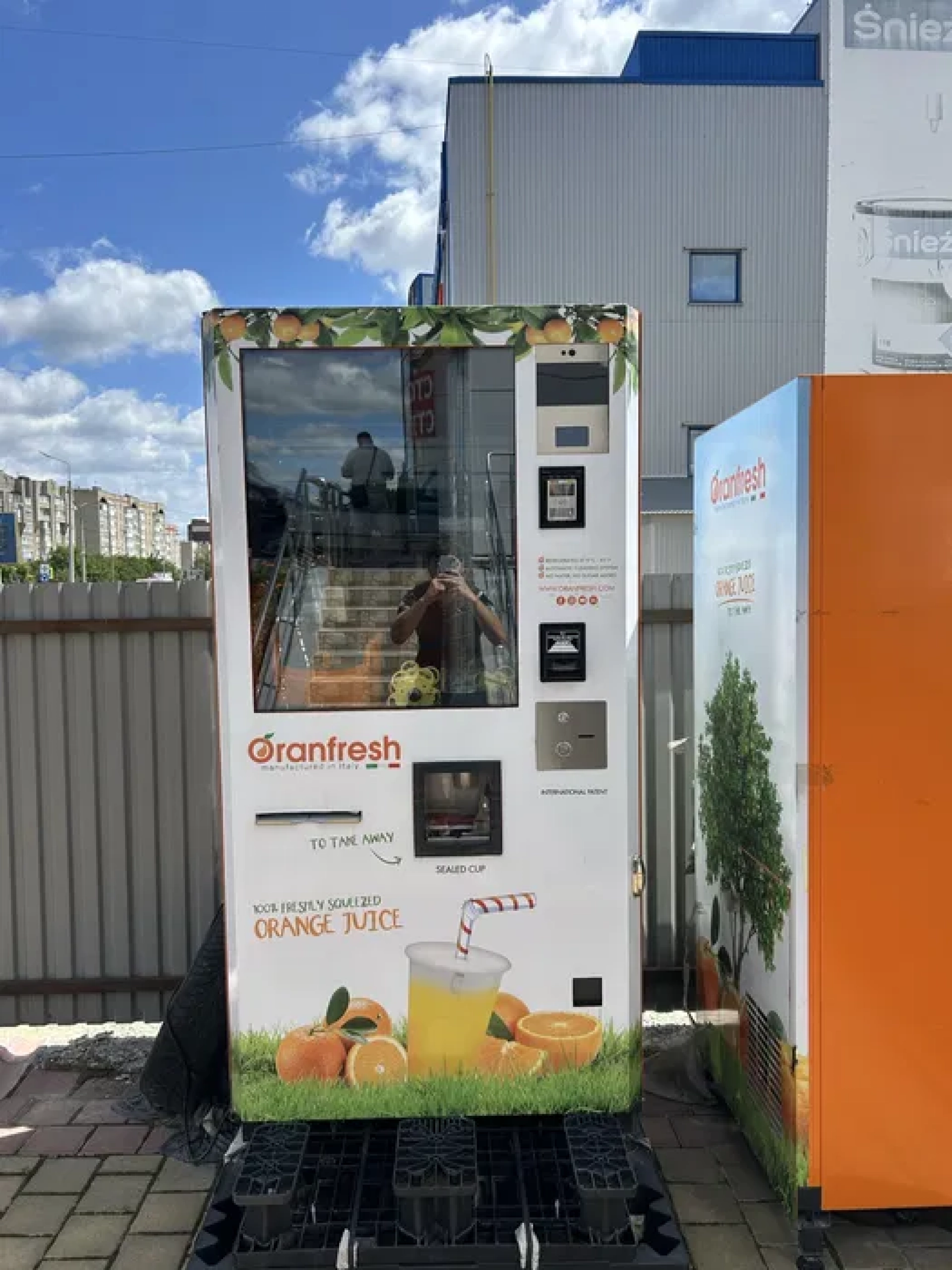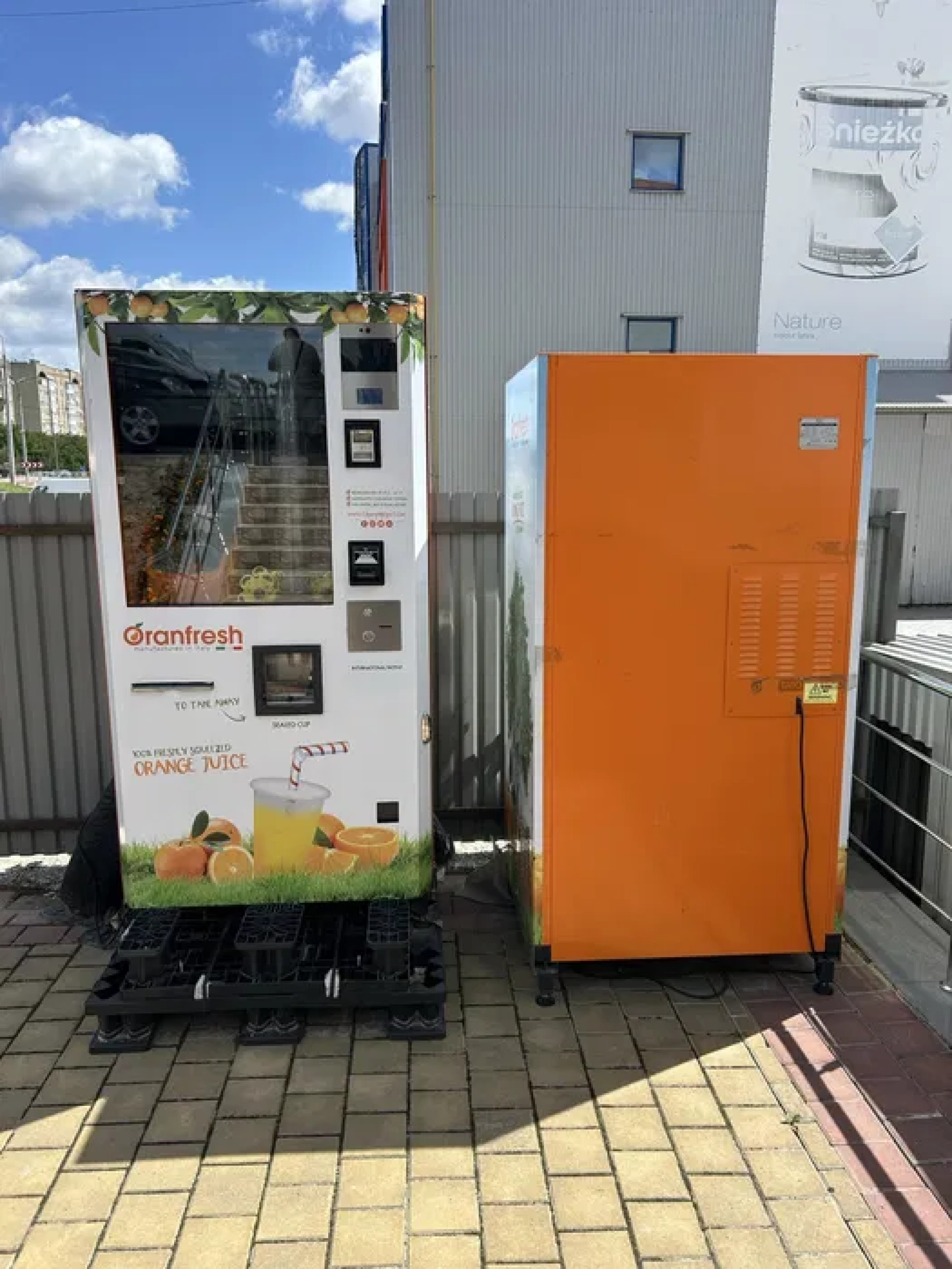 Пропонують професійний апарат для автоматичного приготування свіжого апельсинового соку. Перероблює до 40–60 апельсинів за хвилину, має вбудований холодильник для збереження свіжості фруктів та можливість безготівкової оплати. Ідеальне рішення для торгових центрів, супермаркетів, вокзалів, аеропортів, фітнес-клубів, навчальних закладів та будь-яких місць з великим потоком людей.