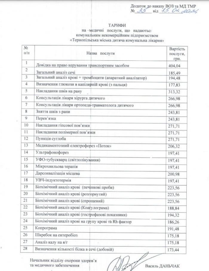 Наказ відділу охорони здоров’я та медичного забезпечення з новими тарифами на медичні послуги 26 квітня опублікували на сайті Тернопільської міської ради.