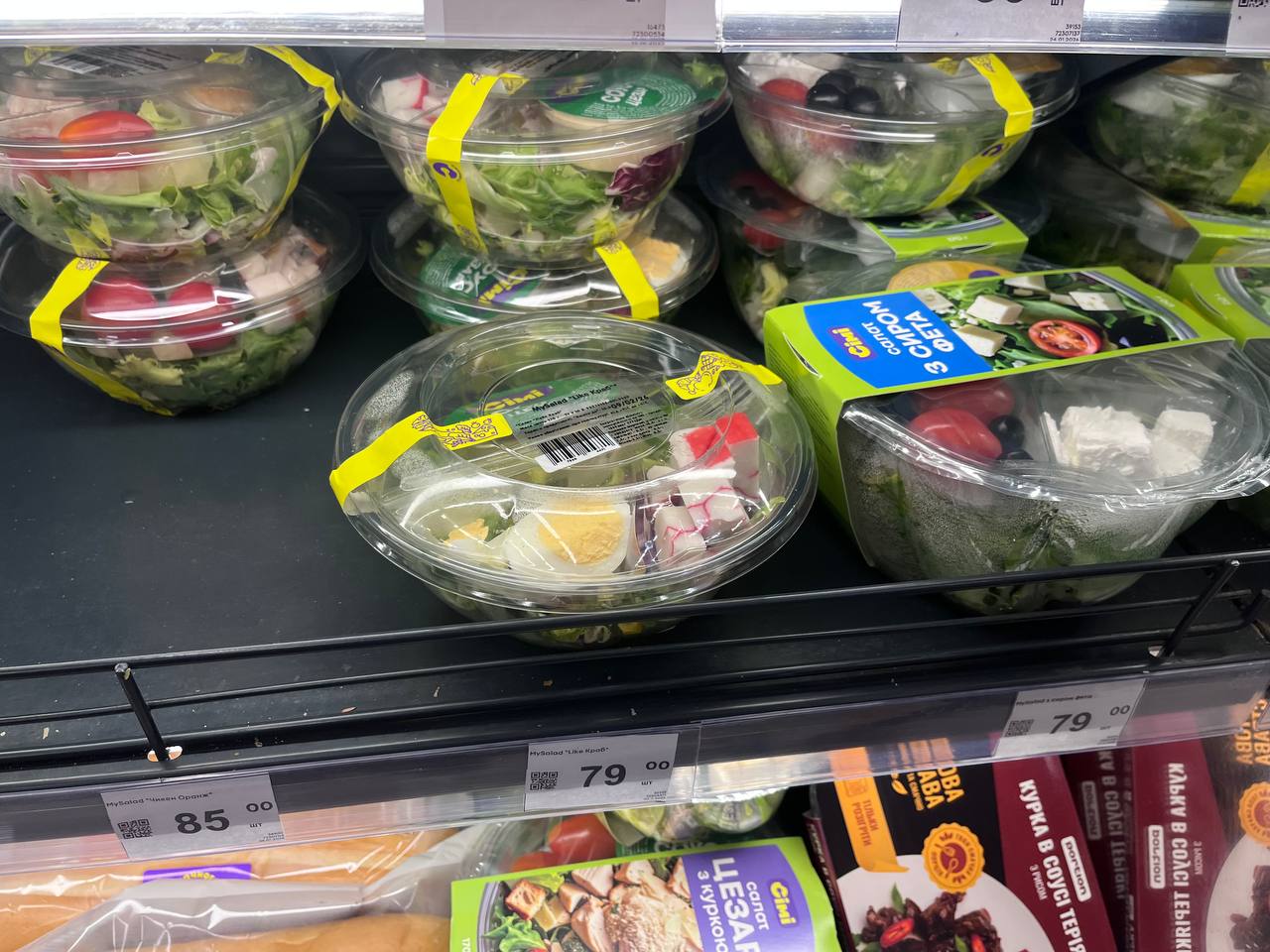 Є і перші страви: суп сирний з куркою та суп грибний з куркою – 83 грн (300 грамів). На упаковці вказано, що розігріти їх можна за три хвилини. Також можна придбати салати. Наприклад, «Чикен Оранж» – 85 грн (300 мл), «Like Краб» та салат із сиром фета – по 79 грн (170 грамів).