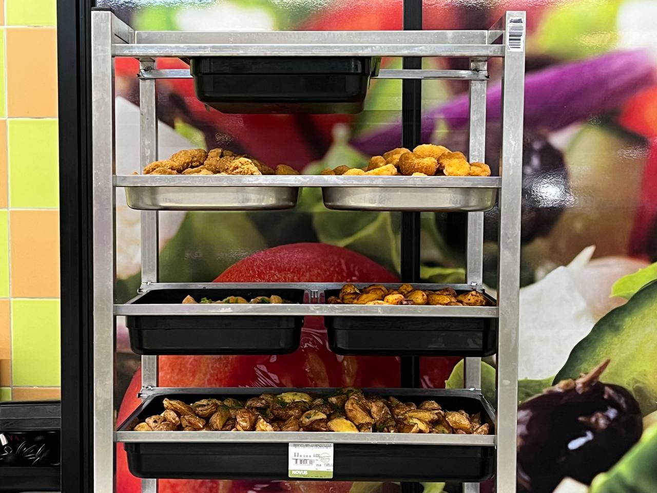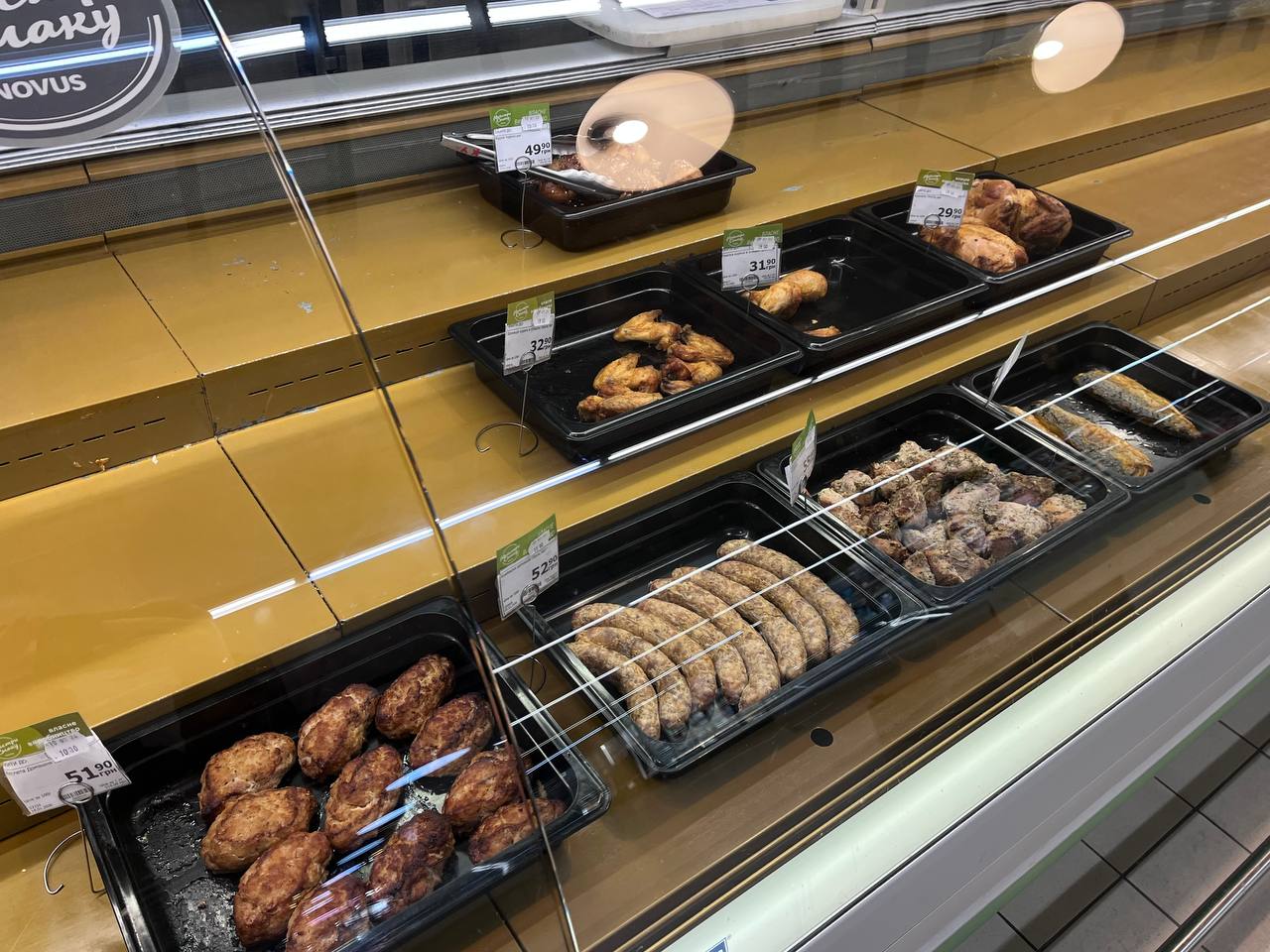 Із м’ясних страв у продажу були биток курячий – 49,90 грн, котлета домашня – 51,90 грн, ковбаски домашні – 52,90 грн, курка теріякі – 49,90 грн, крильця курячі в спеціях гриль – 32,90 грн, гомілки курячі – 31,90 грн, курчата гриль – 29,90 грн. Також пропонують шашлик – 55,90 грн та філе скумбрії гриль – 64,90 грн.