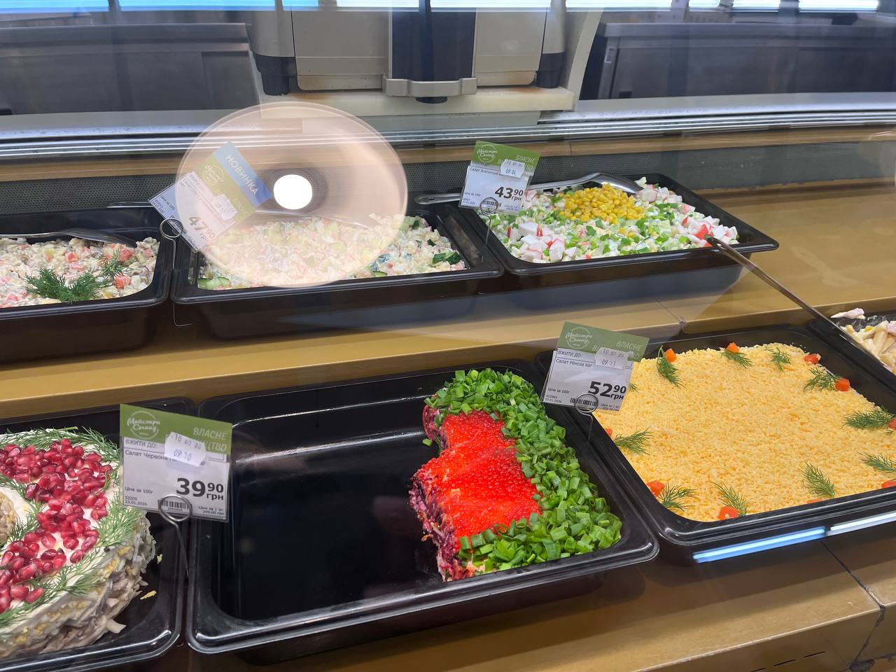 Серед салатів пропонували «Мімозу» – 52,90 грн, «Апетитний» – 43,90 грн, «Хуторський» – 22,90 грн, «Гранатовий браслет» – 41,90 грн, «Червона галявина» – 39,90 грн, «Олів’є» – 32,90 грн.