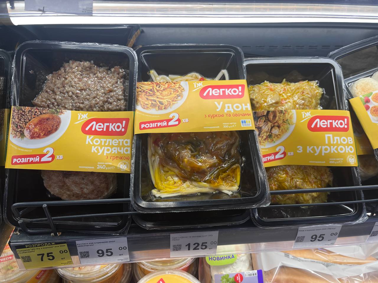 Зокрема, котлета куряча з гречкою коштує 95 грн (220 грамів), удон з куркою та овочами – 125 грн (300 грамів), плов з куркою – 95 грн (250 грамів). Також у продажу є сирники – 95 грн (250 грамів). На упаковці зазначено, що розігріти страви можна за дві хвилини.