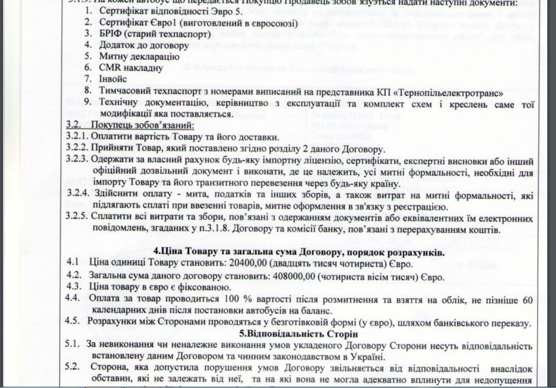 Згідно з оприлюдненим договором, автобуси, які купуватиме Тернопіль, є користованими, не раніше 2007 року випуску і можуть вміщати не менше 80-ти пасажирів. Догорів діятиме до 31 грудня 2019-ого року. А відповідно до оприлюдненої документації конкурсних торгів, термін поставки автобусів до 30 вересня 2019-ого року.