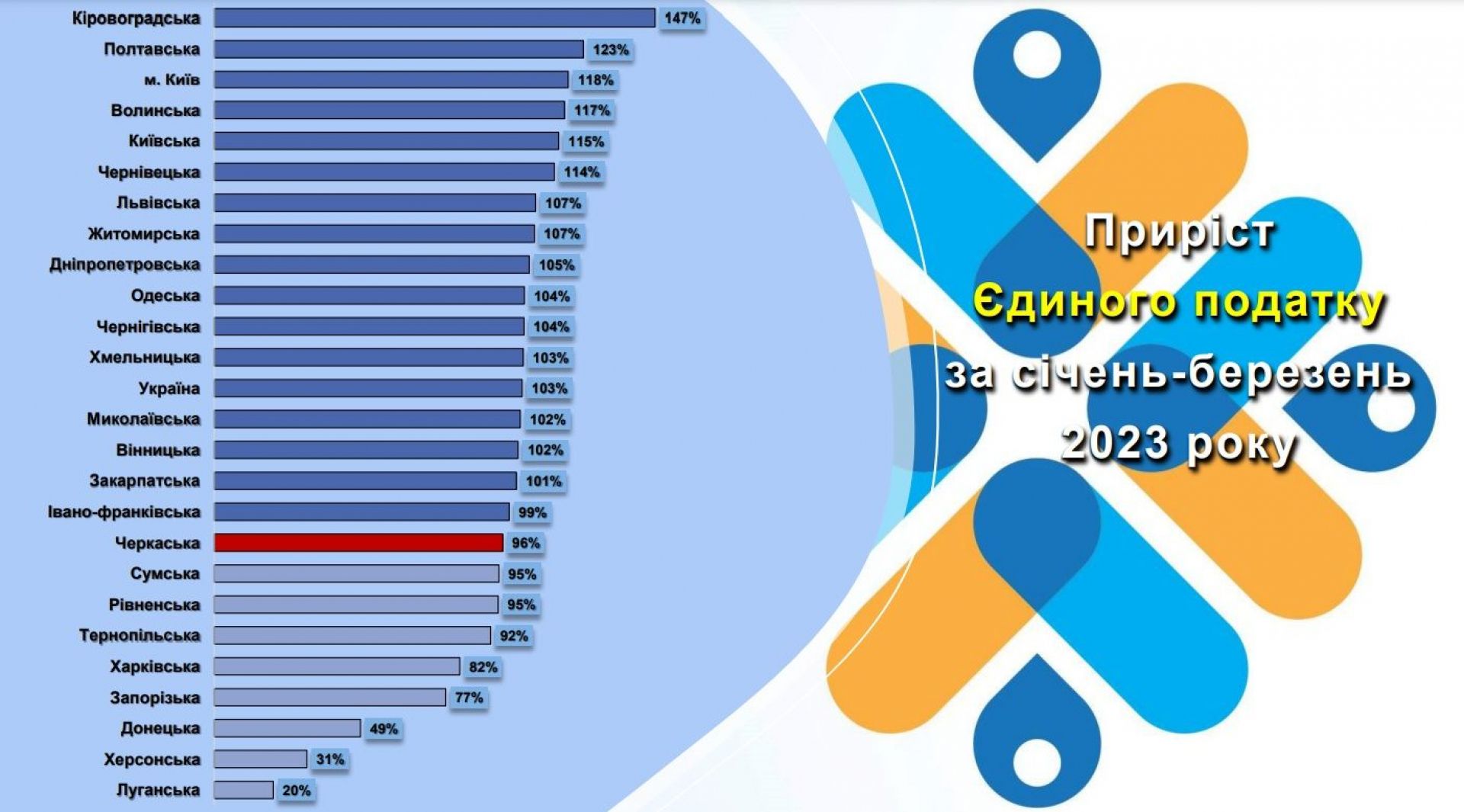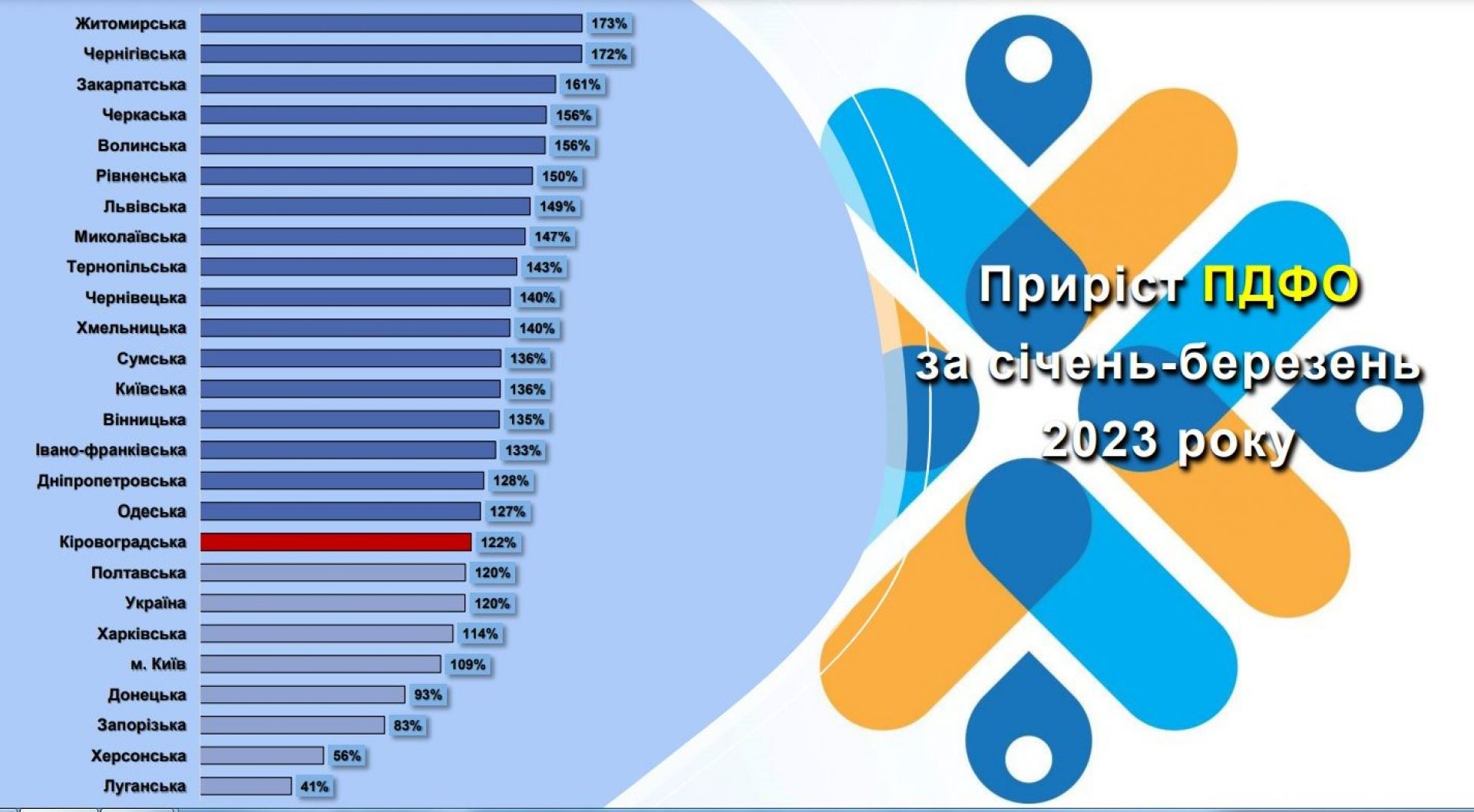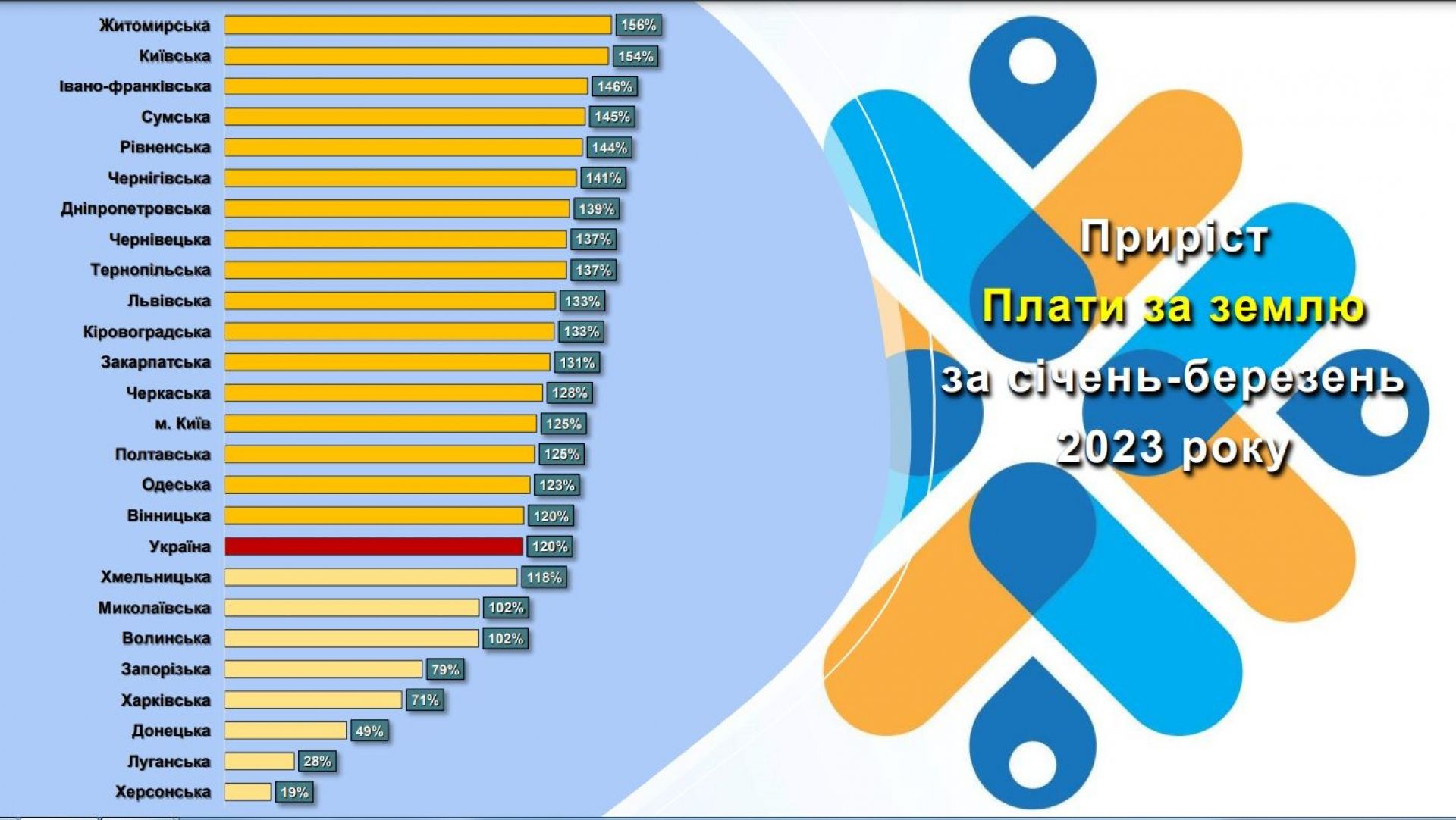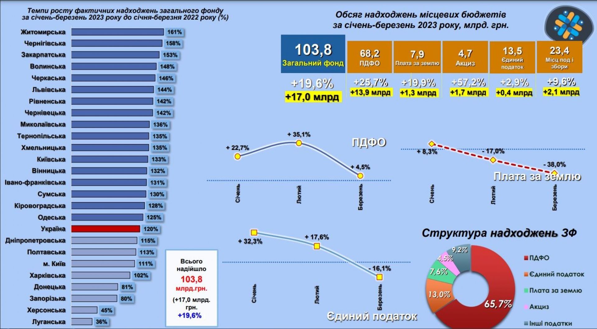 Темпи росту фактичних надходжень загального фонду за січень-березень 2023 року до січня-березня 2022 року (%) Тернопільщини — 135%.