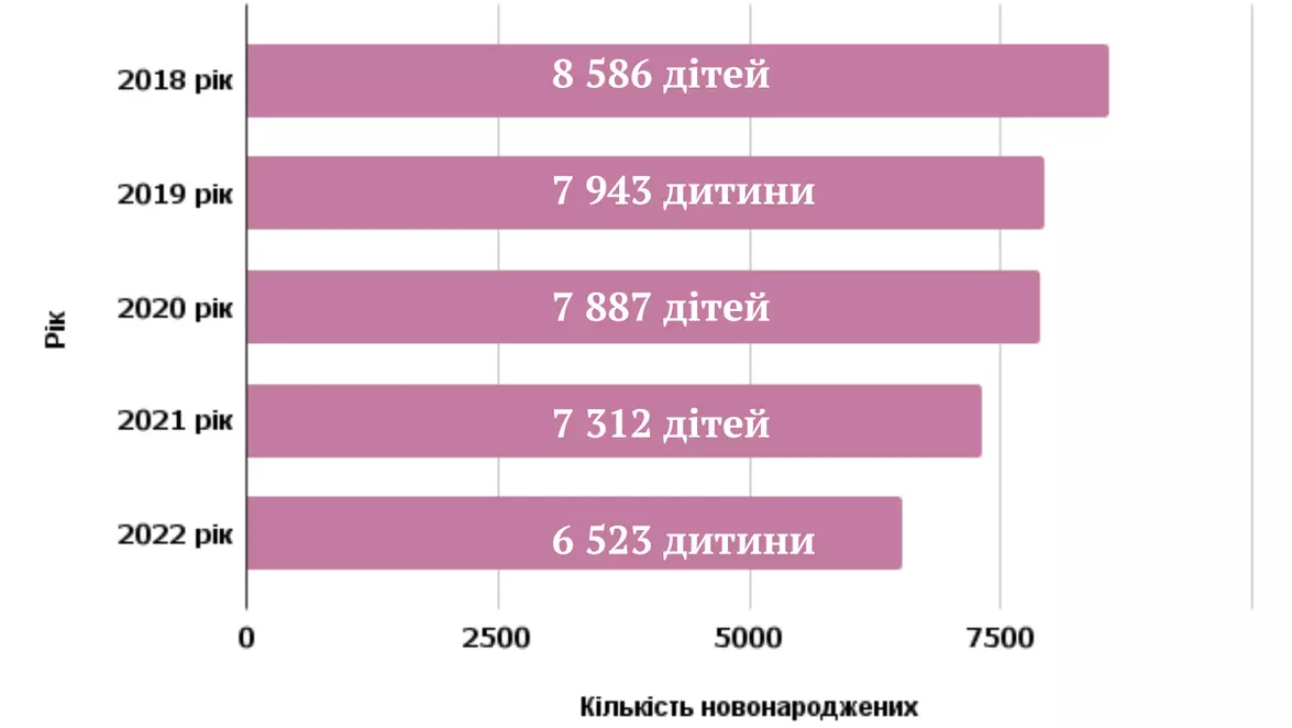 За даними Південно-Західного міжрегіонального управління Міністерства юстиції України, коефіцієнт народжуваності на Тернопільщині з кожним роком знижується. Наприклад, у 2018 році в області народилися 8 586 дітей, а вже у 2022 році – на понад 2000 дітей менше. Як протягом чотирьох років знижувалася народжуваність в області дивіться на графіку.