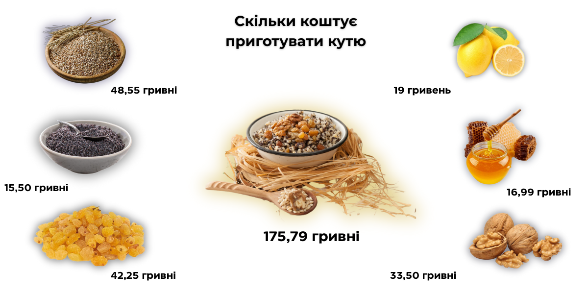 Для прорахунку вартості куті журналісти «20 хвилин» промоніторили ціни на продукти у супермаркеті «Сільпо» без урахування акцій. Вартість 400-грамової упаковки пшениці обійдеться до 55,49 гривні, 200 грамів волоських горіхів – до 134 гривні, 200 грамів родзинок – до 169 гривень, 250 грамів маку – до 77,49 гривні, кілограм лимонів – 129 гривень, стік меду вагою 15 грамів – 16,99 гривні.
