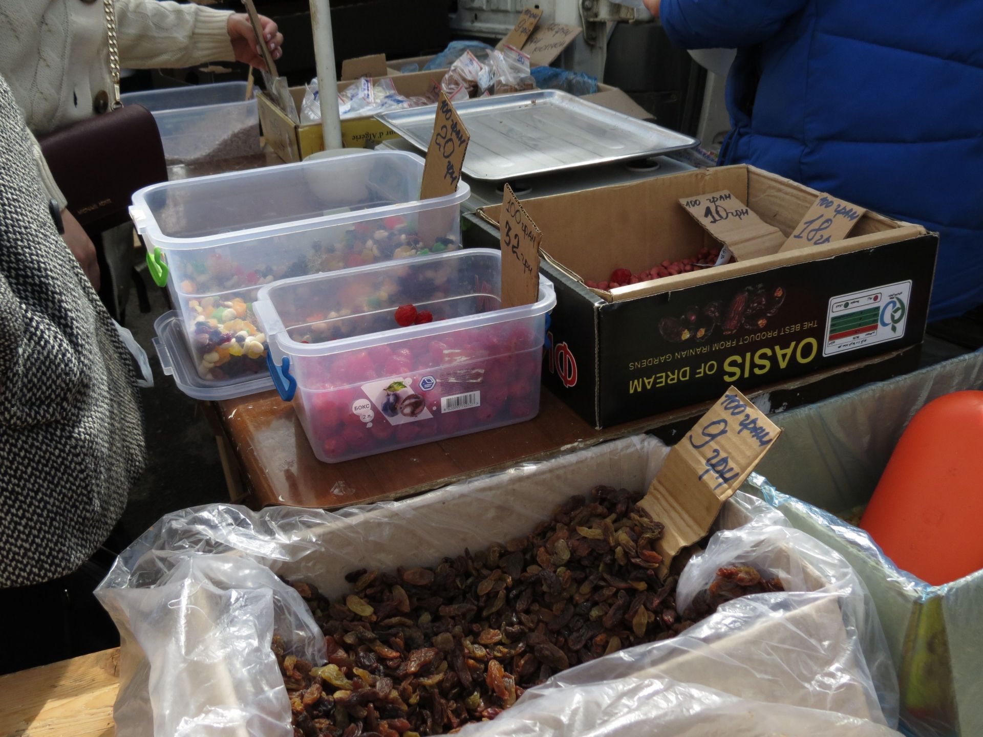 Продають сухофрукти. Родзинки – 9 грн за 100 грамів. Вишня – 32 грн, мікс з сухофруктів та горіхів – по 20 грн.