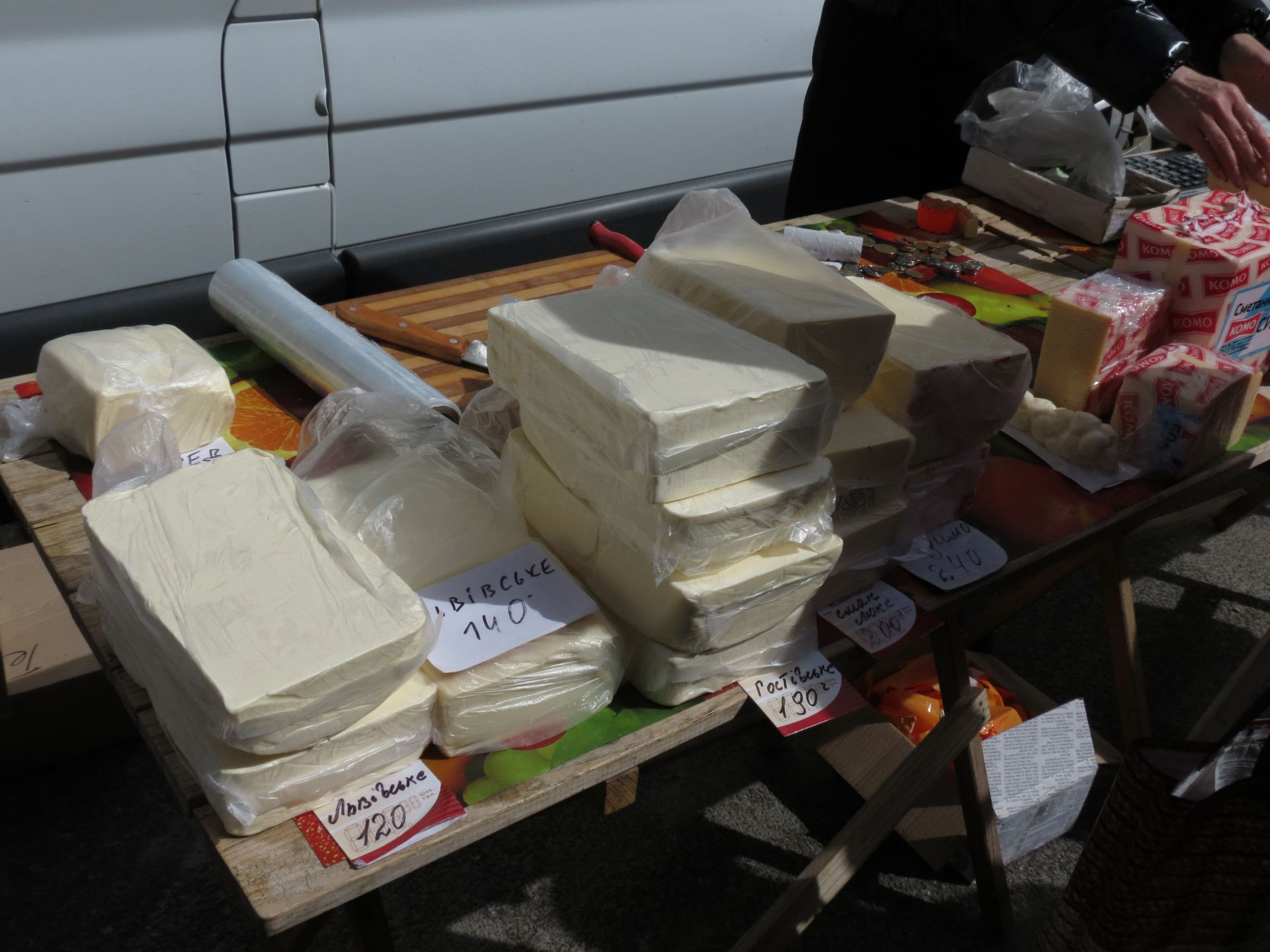 Є і молочка. Масло селянське 73% – 216 грн, сир «Київська Русь» – 185 грн, сир «сметанковий» – 195 грн/грн «Адигейський» – 146 грн.