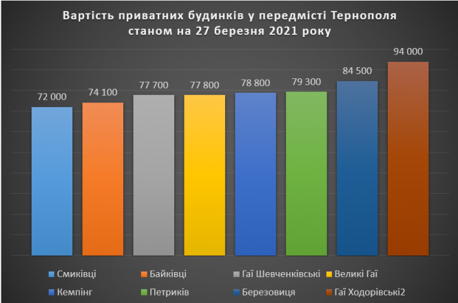 В районах Тернополя приватних будинків продають менше, аніж у передмісті. В таких районах як «Авторинок», «Канада», «Кленовий гай», «Петриків» пропозицій продажу приватного будинку небагато, від однієї до п’яти.