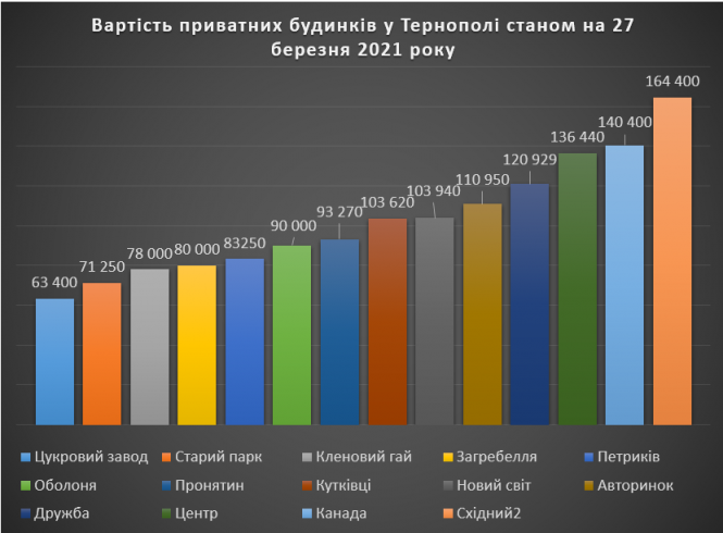 В районі Цукрового заводу приватні будинки найдешевші. Вартують вони в середньому 64,3 тисячі доларів. Дещо дорожчі приватні будинки у районі Старого парку, Кленового Гаю та Загребелля – 71,25 тисяч, 78 тисяч і 80 тисяч доларів відповідно.