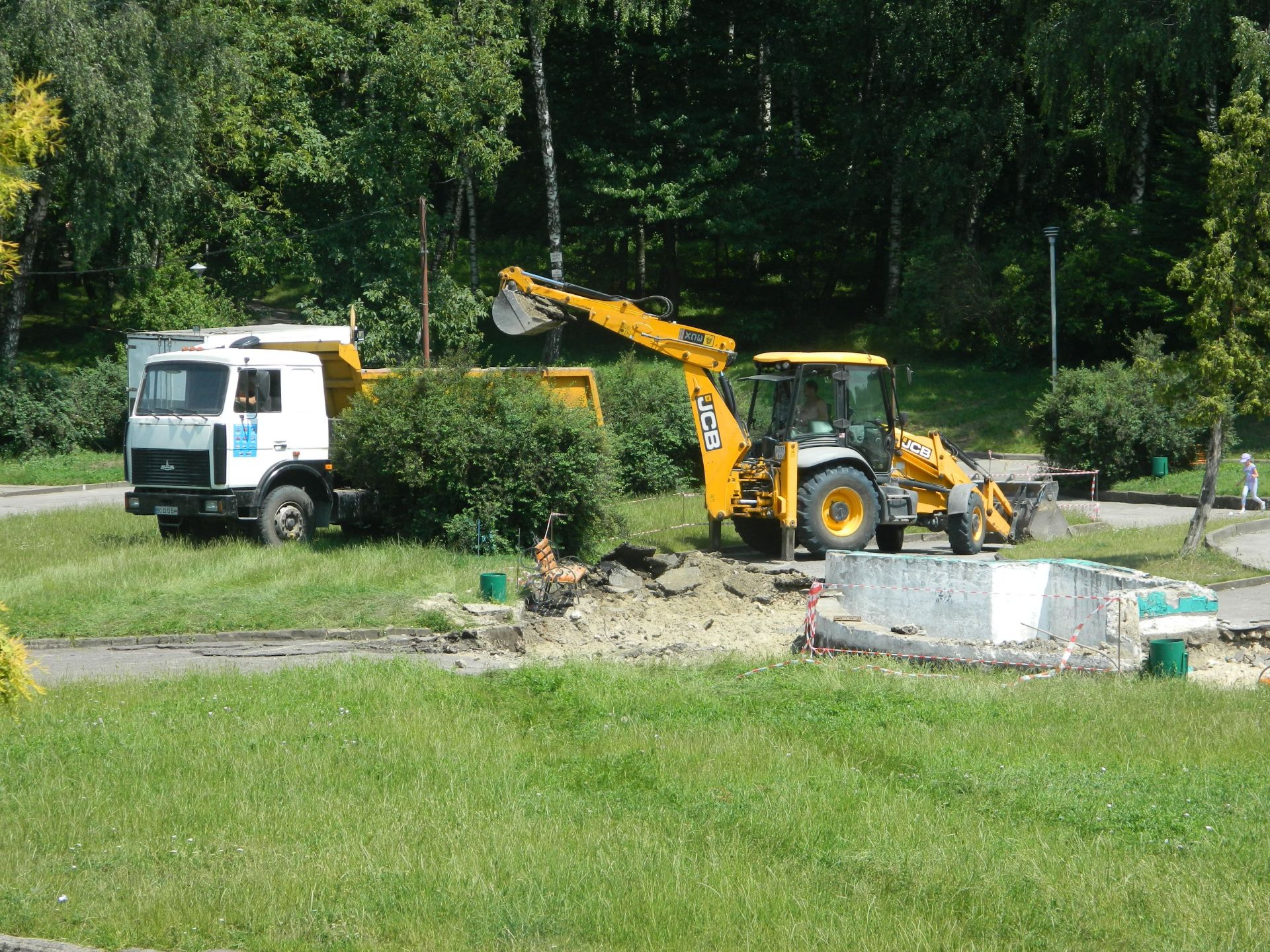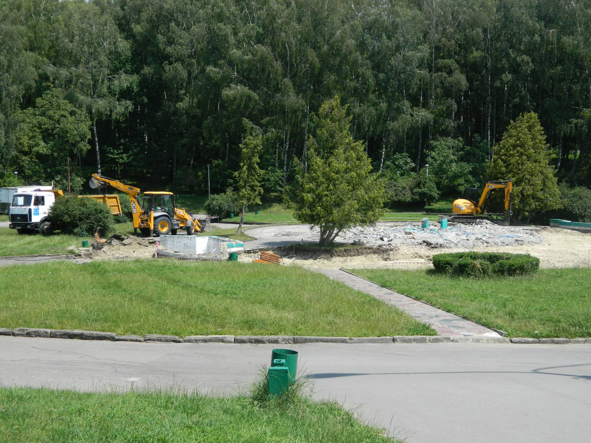 - Товариство “ТОМ-ІнвстБуд” проводить роботи в парку “Національного відродження” з демонтажу фонтану “Олімпіада”, у звязку з цим, що після демонтажних робіт місце треба буде упорядкувати та засипати щебінь. І оскільки великогабаритні машини до фонтану не можуть доїхати, щебінь цей зсипають на площадки, після чого меншими машинами будуть довозити до фонтану, - зазначили у фірмі-виконавиці робіт.