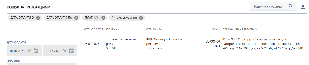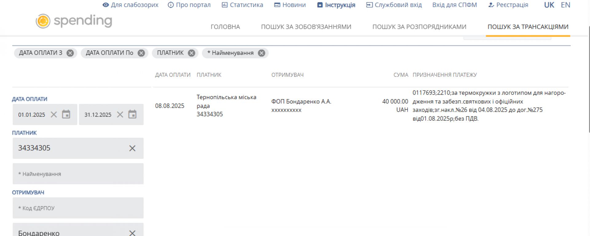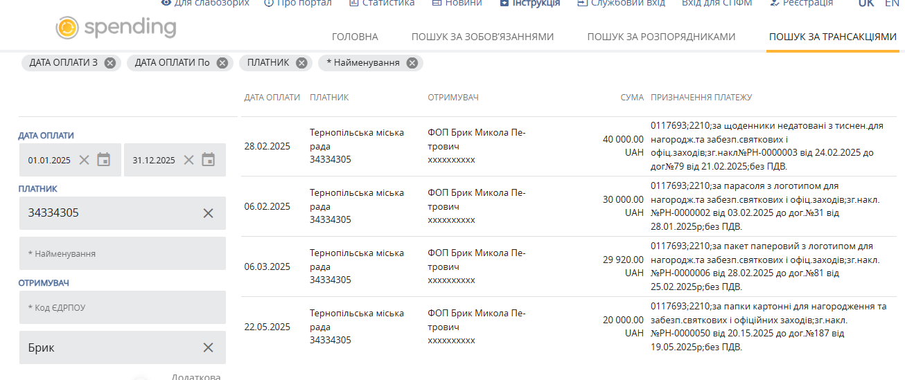 За даними закупівель, і парасолі, і паперові пакети міській раді постачав підприємець Брик Микола Петрович. За даними Spending, у 2025 році міська рада чотири рази перераховувала йому кошти: