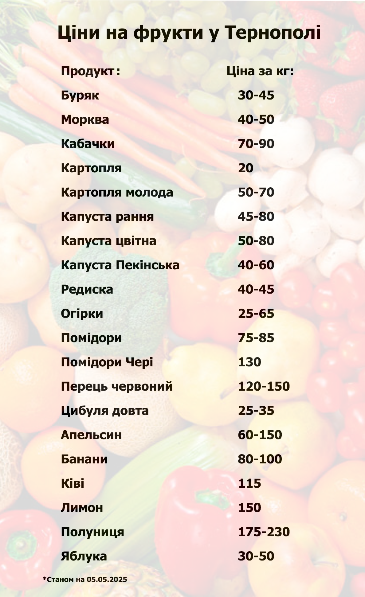 На прилавках побільшало молодих овочів та зелені. Листя салату, руколу, шпинат, зелену цибулю продають від 10-15 грн за 100 грам. Старої капусти вже не знайти. Натомість є молода. Ціни на неї знизились за останні два тижні. Раніше її продавали в середньому по 75 грн/кг. Тепер можна знайти від 45 грн.