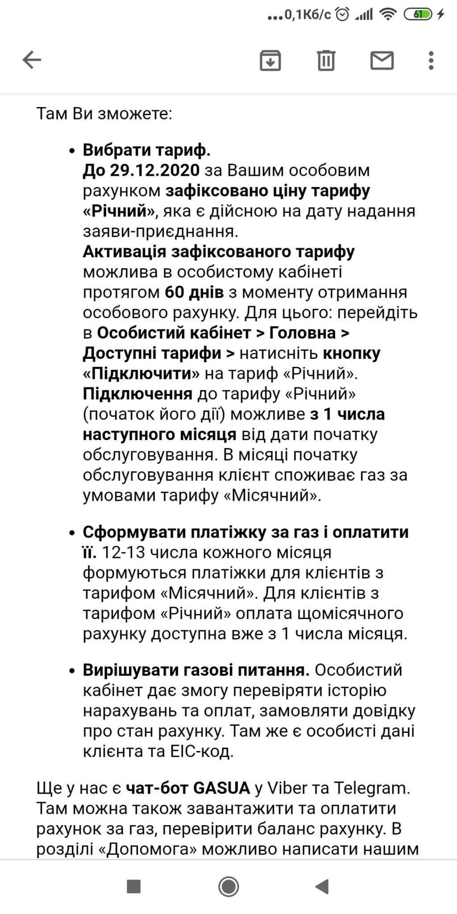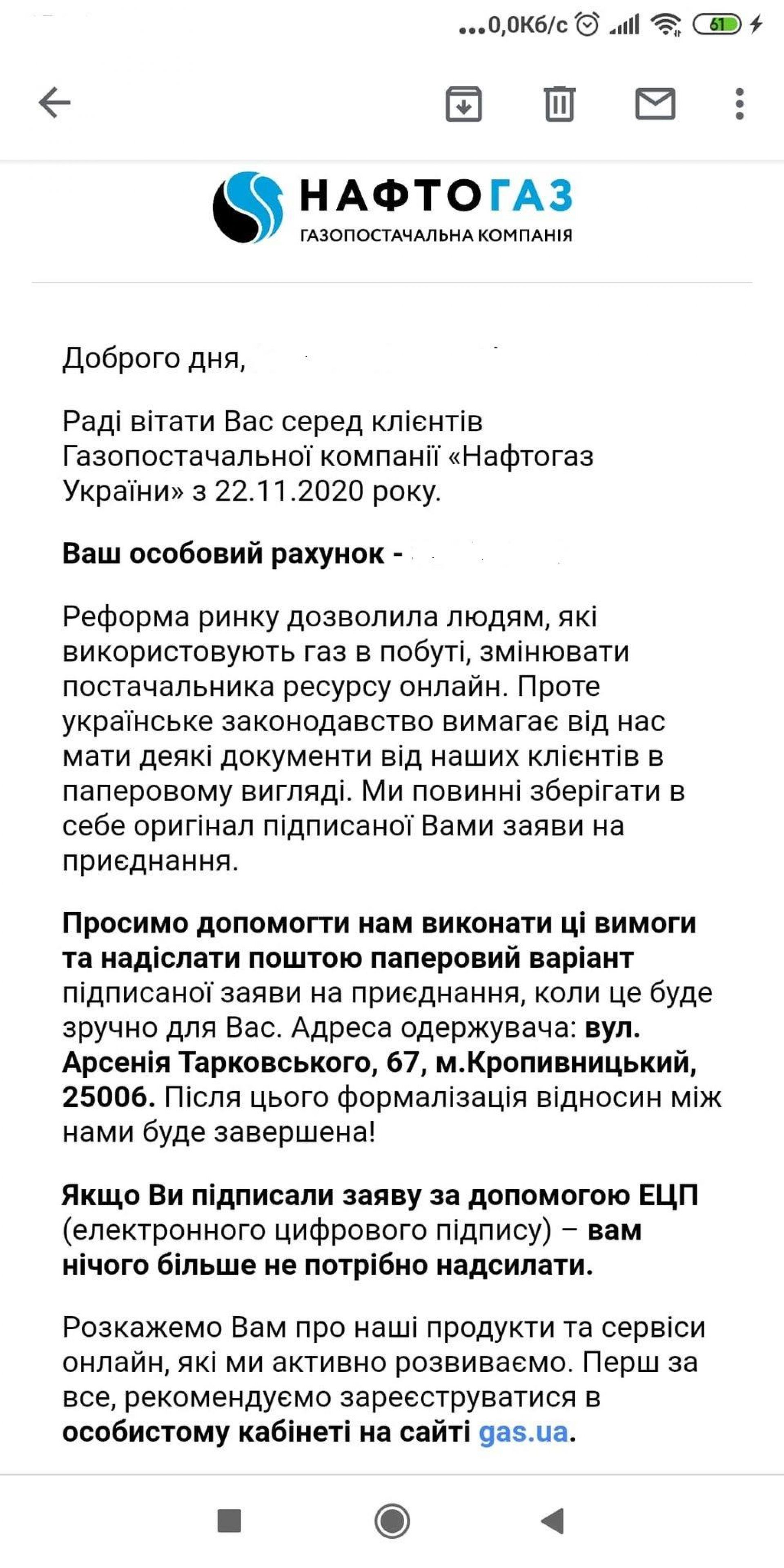 – Я подала заяву на сайті компанії-постачальника 1 листопада. Оскільки в мене немає електронного підпису, видрукувала відповідну заяву на сайті компанії, поставила власний підпис та надіслала на електронну адресу. Уже 22 листопада мені на пошту надіслали відповідь, що ми стали клієнтами даної компанії, – каже вона.