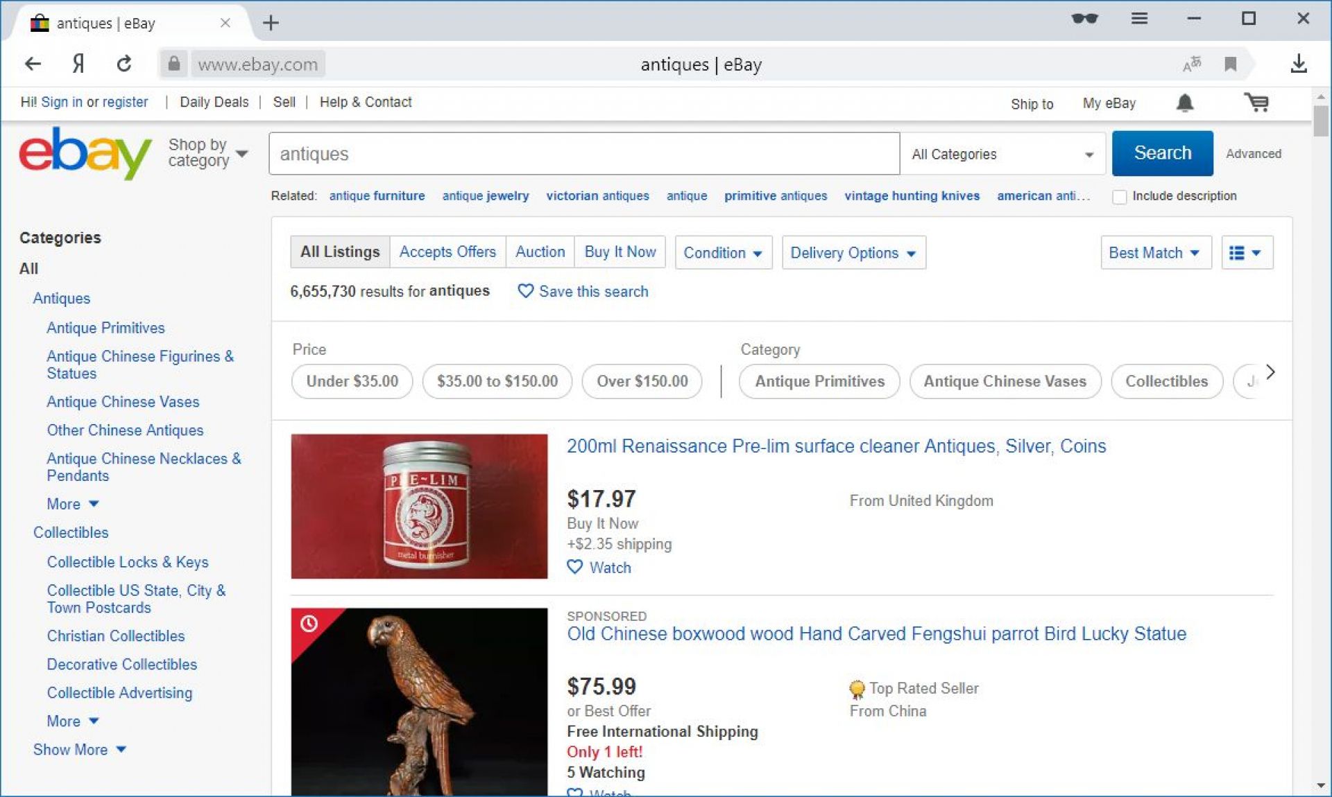 Для того, щоб знайти необхідну річ – спершу переходимо на сайт. Там, як і в звичайному інтернет-магазині, вводимо запит в пошукову форму. Оскільки на цій платформі може продавати будь-хто та фактично будь-що – знайти можна як нові речі, так і користовані. Ми будемо шукати антикваріат. Вносимо запит в форму і отримуємо результат. Можна відсортувати усі товари. Зробимо від найдорожчих до найдешевших «Price + Shipping: highest first». Навіть мінімальних знань англійської мови буде достатньо. До того ж, інтерфес інтуїтивно зрозумілий і нагадує будь-який інтернет-магазин або дошку оголошень.