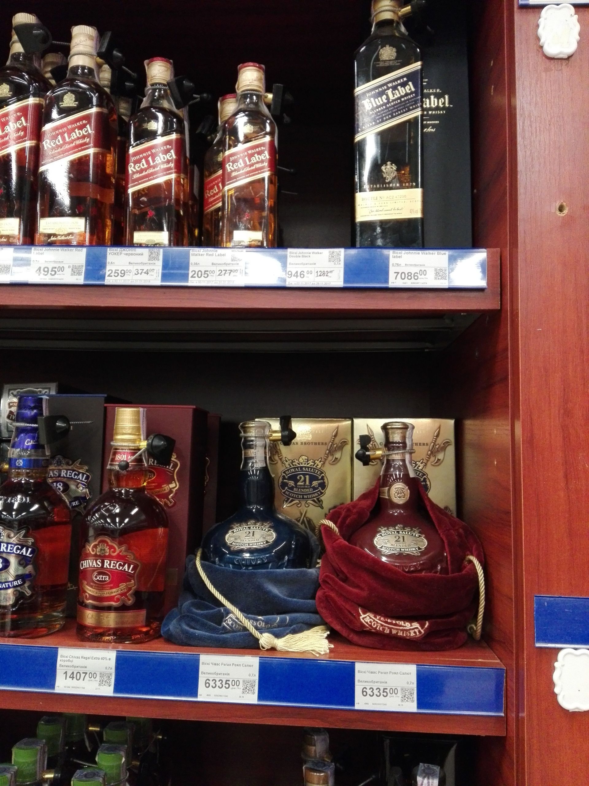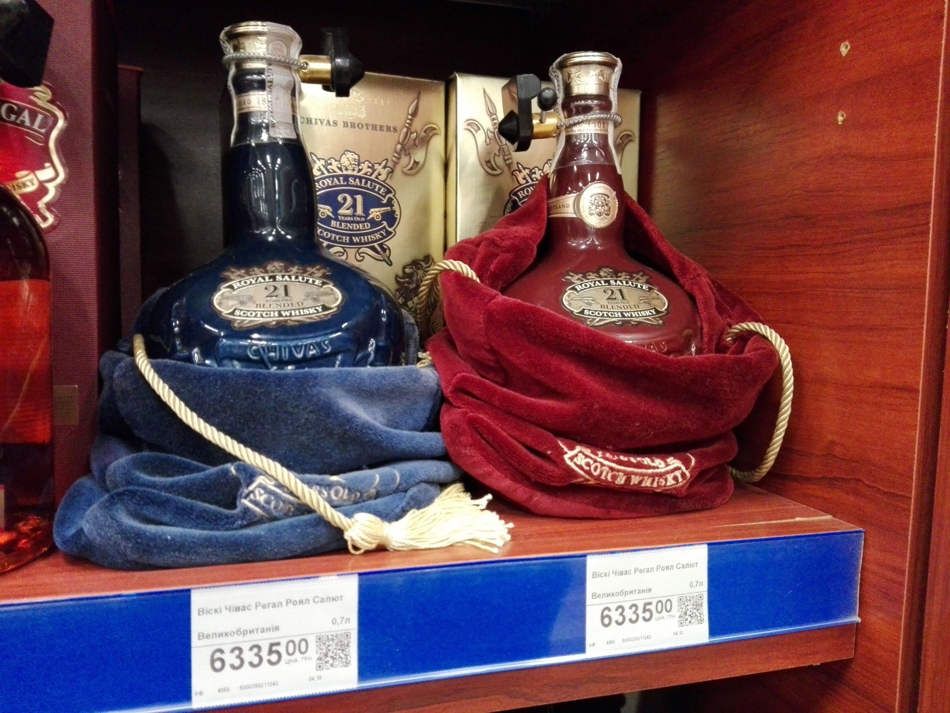 У “Сільпо” одна з найдорожчих пляшок - це Johnnie Walker Blue-label, вартість якої дещо більше 7 000 грн. Також там є віскі Chivas Regal Royal Salute за 6 335 грн. Алкоголю за півмільйона гривень ми не знайшли.