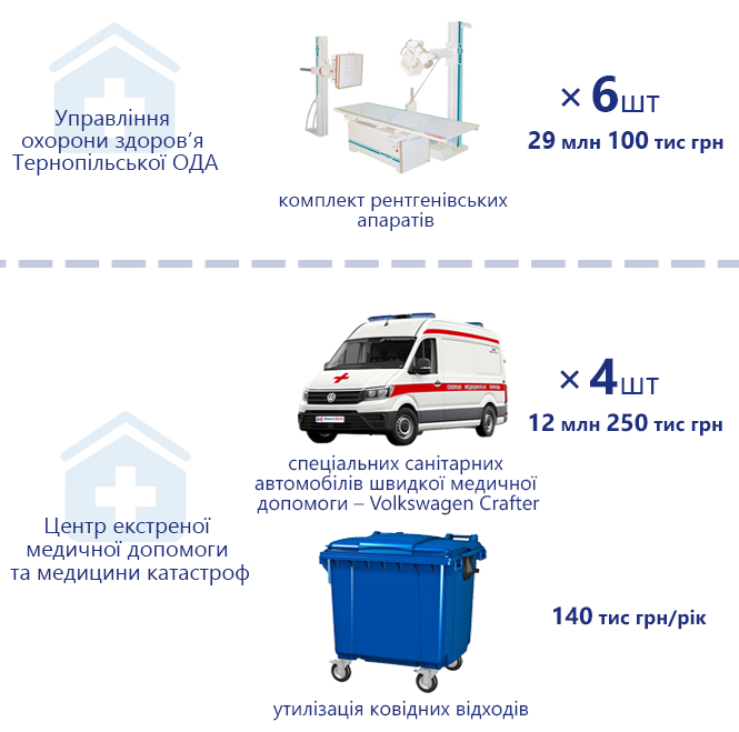 У системі держзакупівель Prozorro від початку пандемії знаходимо дві публічні закупівлі. Найдорожча була оголошено ще у грудні 2020 року на шість комплектів рентгенівських апаратів. Її ціна – 29 млн 100 тис. грн. Якщо розділити, то один такий апарат вартує аж 4 млн 850 тис. грн. Переможцем аукціону стало товариство «Медіапрайм». Із шести апаратів три апарати замовили у місто Тернопіль, по одному – у м. Бережани, м. Чортків і м. Кременець.