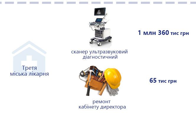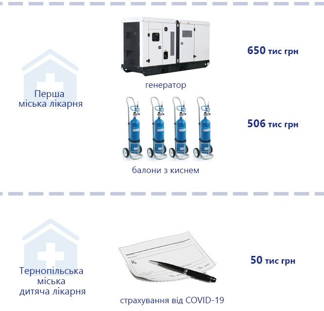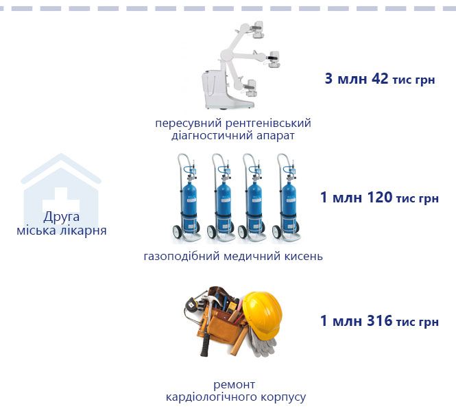Найдорожчими серед них стали такі: пересувний рентгенівський діагностичний апарат за три мільйона 42 тисячі грн, газоподібний медичний кисень за один мільйон 120 тисяч грн а також ремонтні роботи. Наприклад, за один мільйон 316 256 грн зремонтували приміщення кардіологічного корпусу, де розгорнуті ліжка для допомоги ковідним пацієнтам.