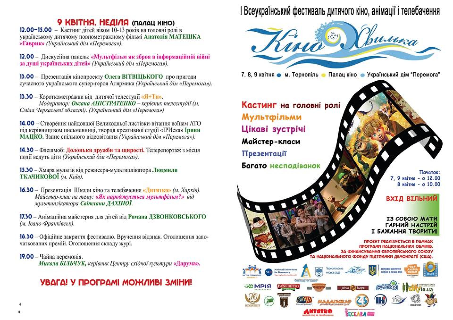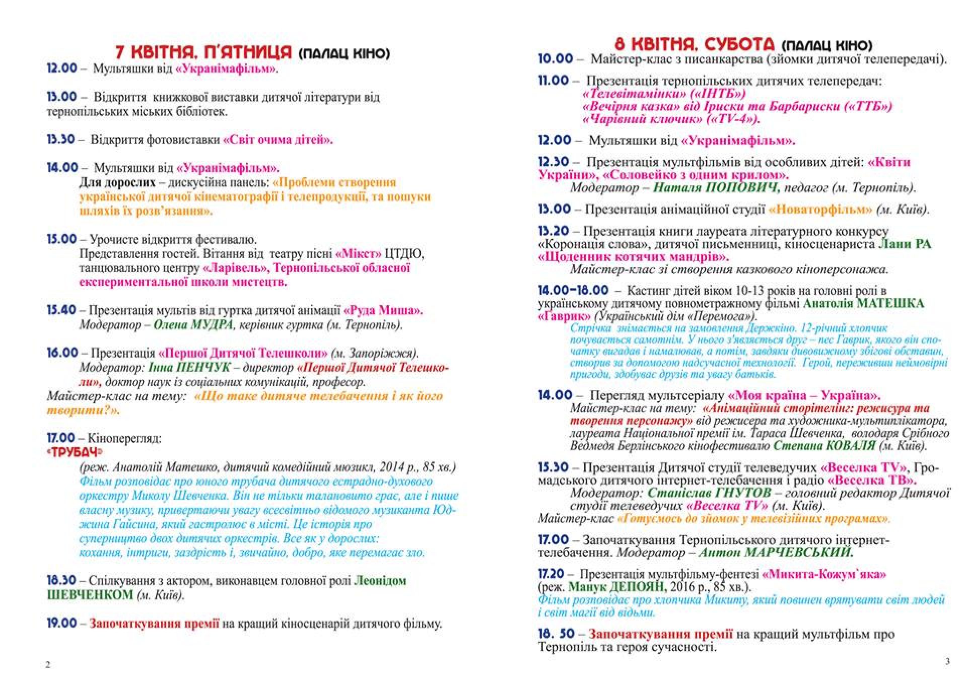 На тернополян віком від чотирьох до шістнадцяти років чекають презентації дитячих телепередач та дитячої телешколи, анімаційні майстерні, писанкарський майстер-клас, створення найдовшої великодньої листівки-вітання воїнам АТО, цікаві флеш-моби та перегляд дитячих кінострічок та мультфільмів. Крім того юних тернополян навчатимуть творити власні відеошедеври і спробувати себе в ролі телеведучих. До уваги дорослих відвідувачів фестивалю – дискусійні панелі, презентації, творчі зустрічі та майстер-класи.