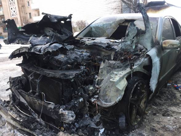Авто палало в дворі на вул. Живова, 37 в ніч з 23 на 24 січня. Обгорений Mercedes звідти досі не забрали.