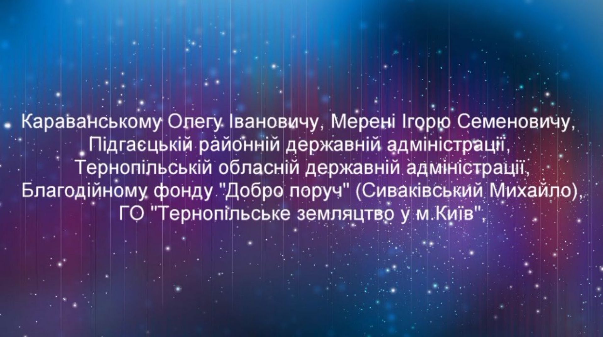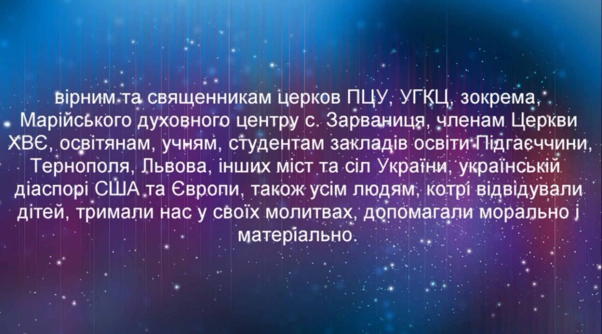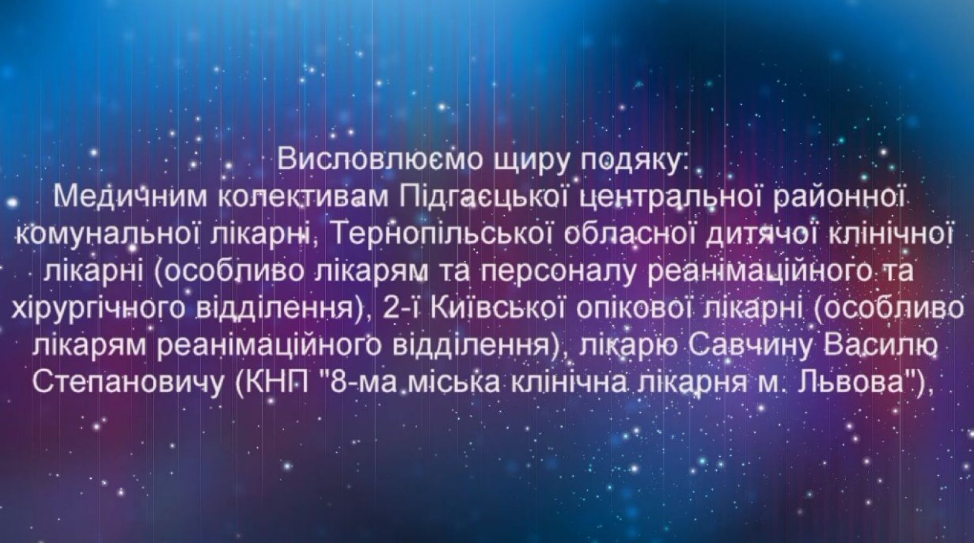 — Висловлюємо щиру подяку медичним колективам Підгаєцької райлікарні, дитячої обласної, 2 київської опікової лікарні – особливо реанімації двох закладів, лікарю 8 міськлікарні Львова Василю Савчину, — це лише початок. Далі йде чималий перелік тих, кому дякують за врятовані життя дітей. — Ми не знаємо вас усіх, але вас знає Бог, тож просимо в нього для вас благословінь, охорони, Господньої благодаті, миру і радості. Христос Рождається! Славімо Його!