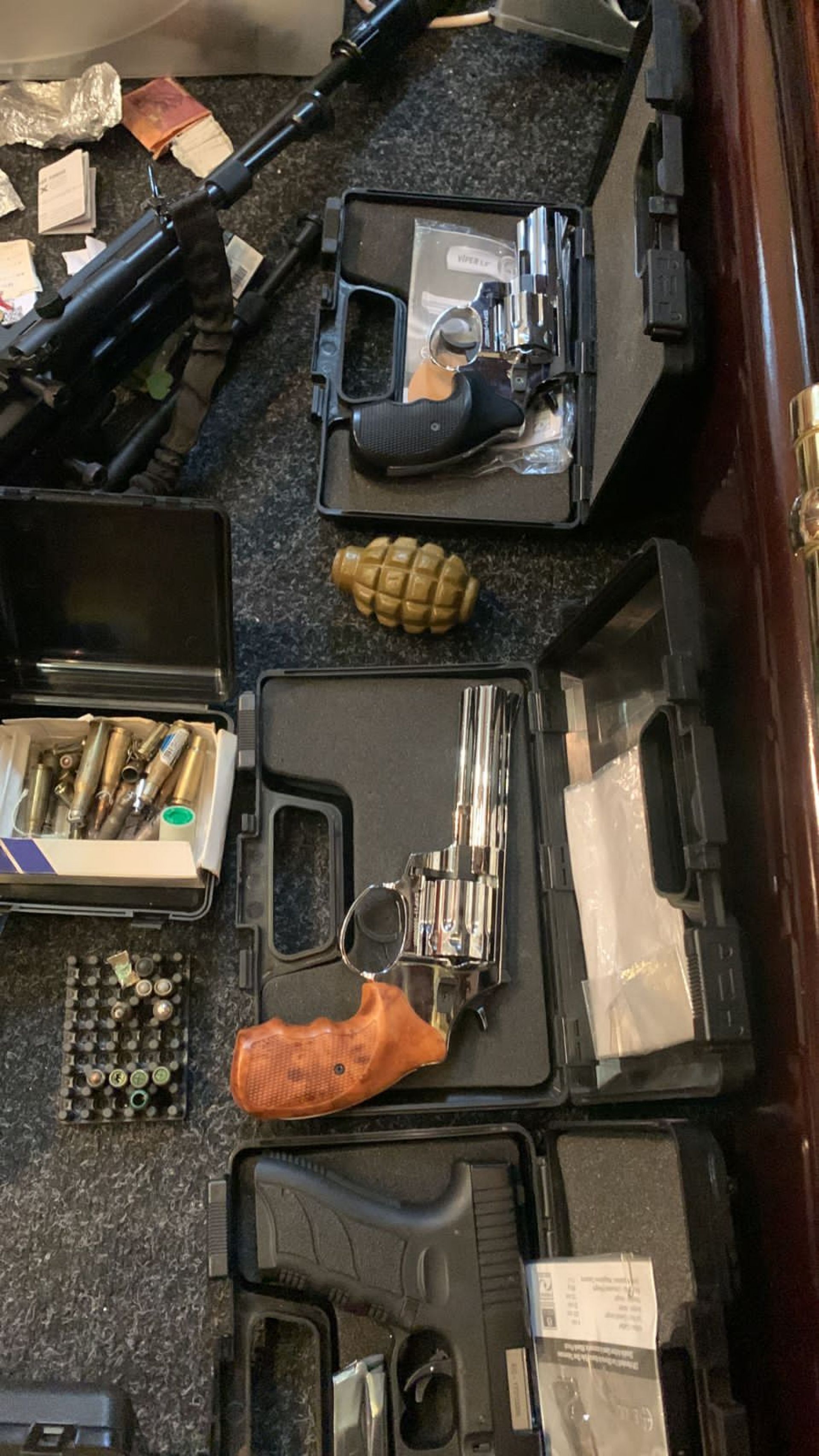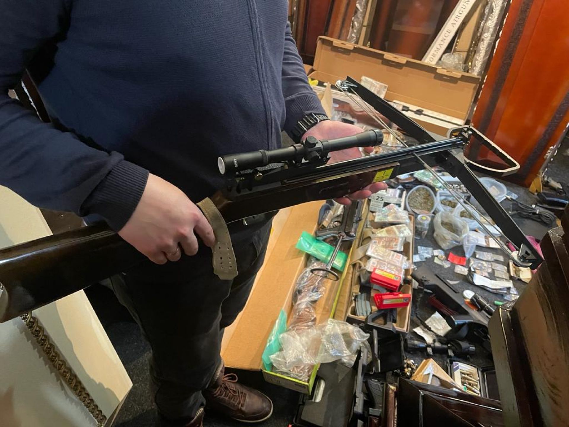 Під час санкціонованого обшуку в приміщенні бюро поліцейські виявили та вилучили автомат, пістолети з магазинами, велику кількість набоїв різного калібру, гранату «Ф-1», арбалет.