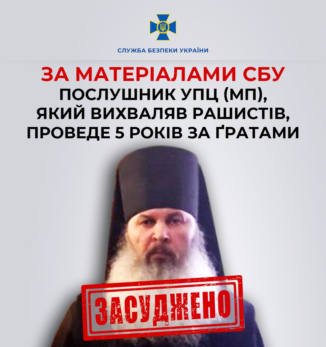 За матеріалами СБУ, послушнику УПЦ (МП), який вихваляв рашистів, призначили покарання у вигляді позбавлення волі строком на 5 років з конфіскацією майна та позбавленням права обіймати посади у правоохоронних органах України, органах державної влади, органах місцевого самоврядування та в органах, що надають публічні послуги строком 15 років. До слова, послушник мав непогашену судимість за вбивство й проживав на території монастиря з 2017 року.