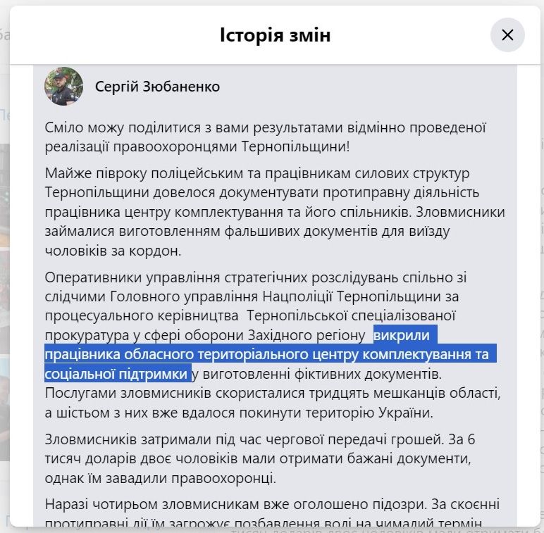 — Оперативники управління стратегічних розслідувань спільно зі слідчими Головного управління Нацполіції Тернопільщини за процесуального керівництва Тернопільської спеціалізованої прокуратури у сфері оборони Західного регіону викрили працівника обласного територіального центру комплектування та соціальної підтримки у виготовленні фіктивних документів. Послугами зловмисників скористалися 30 мешканців області, а шістьом з них вже вдалося покинути територію України, — йдеться у повідомленні.