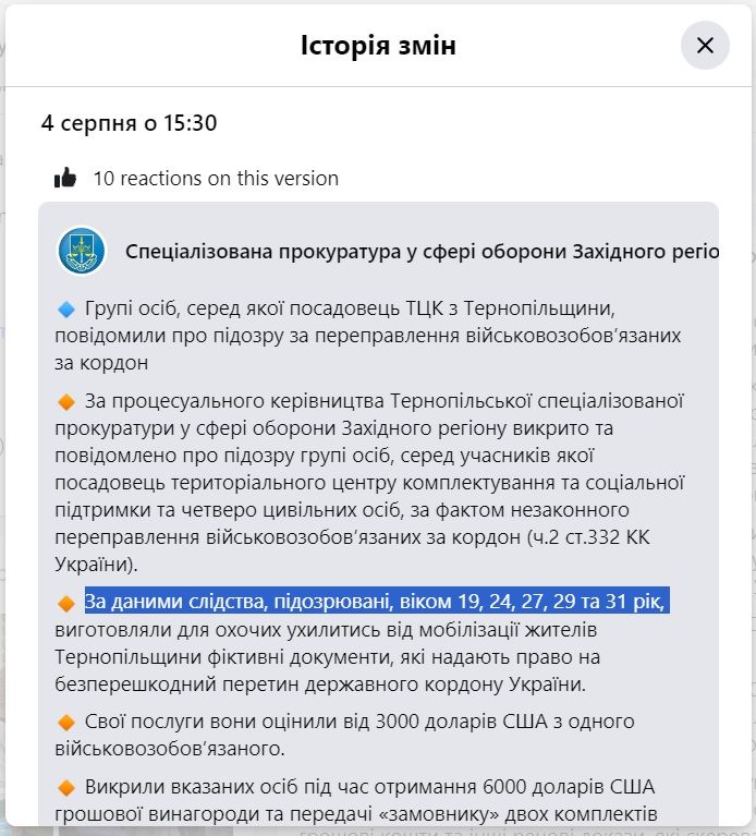 — На інформаційних ресурсах різних силових структур поширена інформація щодо повідомлення про підозру посадовцю Тернопільського ТЦК СП за фактом незаконного переправлення військовозобов’язаних за кордон, — йдеться у повідомленні Тернопільський обласний ТЦК СП. — Станом на даний час жодних підозр посадовим особам територіальних центрів комплектування та соціальної підтримки Тернопільської області не винесено.