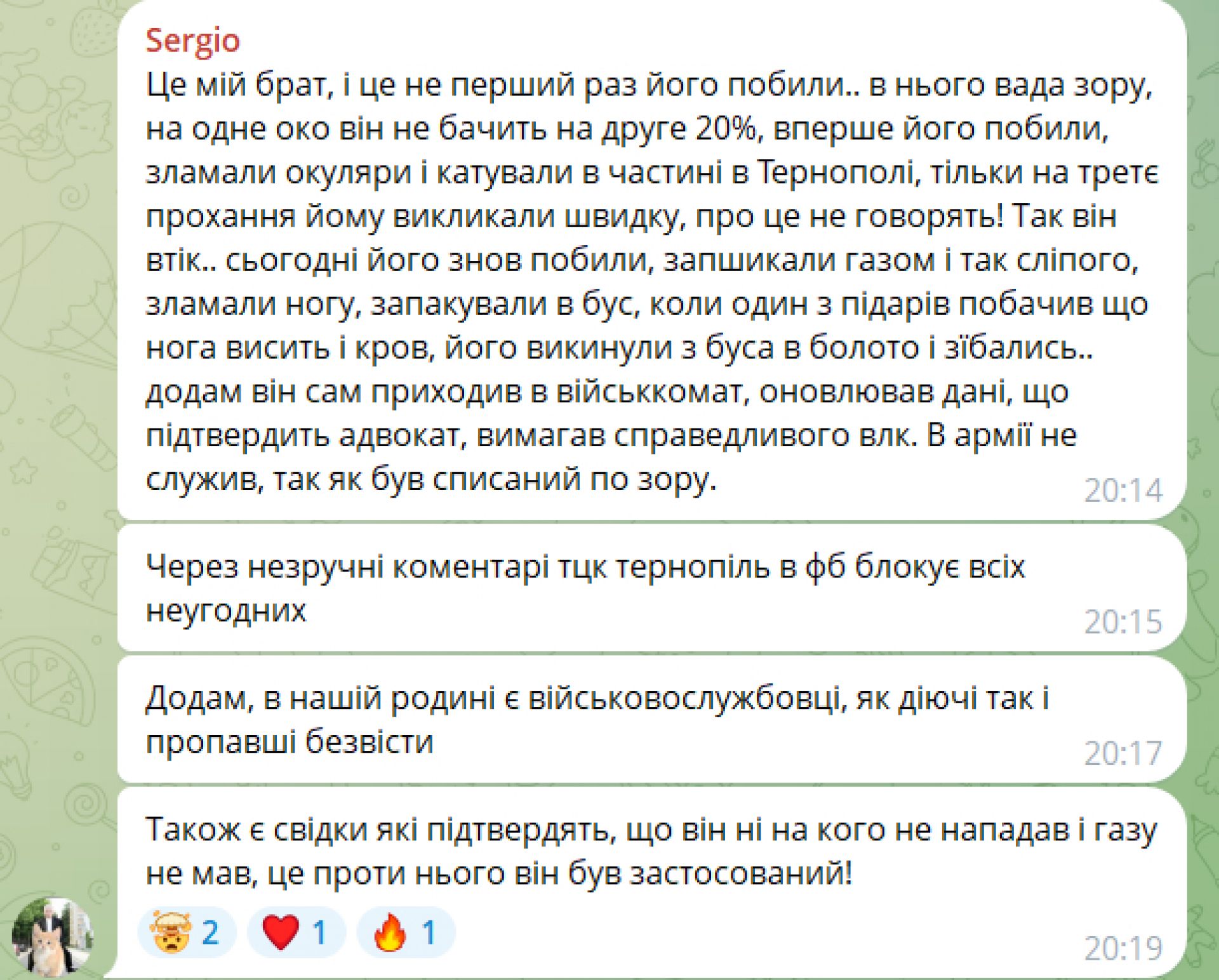 – Це мій брат, і це не перший раз, коли його побили. У нього вада зору: на одне око він не бачить, на друге – 20%. Вперше його побили, зламали окуляри і катували в частині в Тернополі. Лише на третє прохання йому викликали швидку – про це не говорять! Так він утік. Сьогодні його знову побили, запшикали газом, і так сліпого, зламали ногу, запакували в бус. Коли один із працівників побачив, що нога висить і є кров, його викинули з буса в болото і поїхали. Також є свідки, які підтвердять, що він ні на кого не нападав, газу не мав. Це проти нього він був застосований. Додам: він сам приходив у військкомат, оновлював дані, що підтвердить адвокат, вимагав справедливого ВЛК. В армії не служив, оскільки був списаний за станом зору. Додам: у нашій родині є військовослужбовці – як діючі, так і зниклі безвісти», – написав пан Сергій у редакцію.