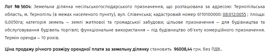«Лот №5604: Земельна ділянка несільськогосподарського призначення, що розташована за адресою: Тернопільська область, м. Тернопіль (в межах населеного пункту), вул. Слівенська; кадастровий номер 6110100000:08:012:0055; площа: 0,0050га; категорія земель – землі житлової та громадської забудови; цільове призначення – для будівництва та обслуговування будівель торгівлі; функціональне використання – під будівництво об’єкту комерційного призначення. Термін оренди – 10 років.