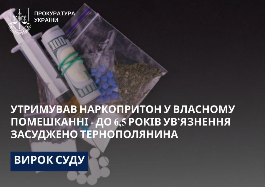 У Тернополі винесли вирок місцевому мешканцю, який перетворив власну квартиру на осередок для вживання та збуту наркотиків. За сукупністю злочинів — організацію притону та торгівлю психотропами — суд призначив чоловіку 6,5 років позбавлення волі з конфіскацією майна.