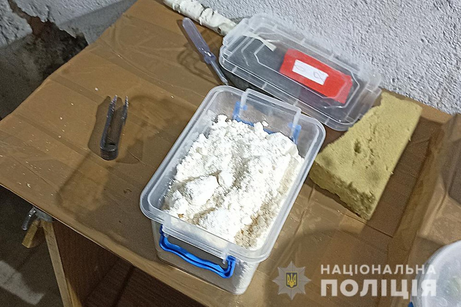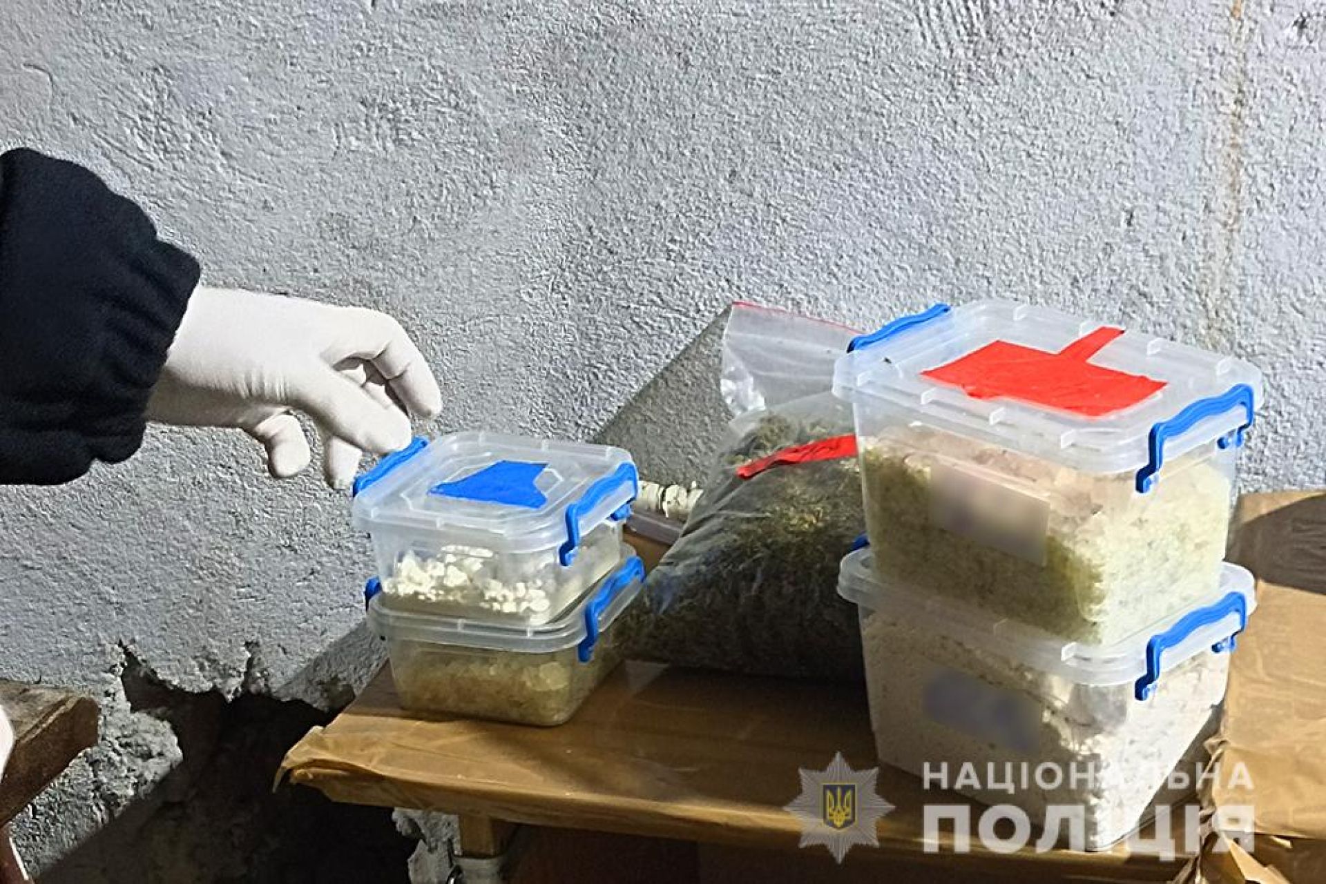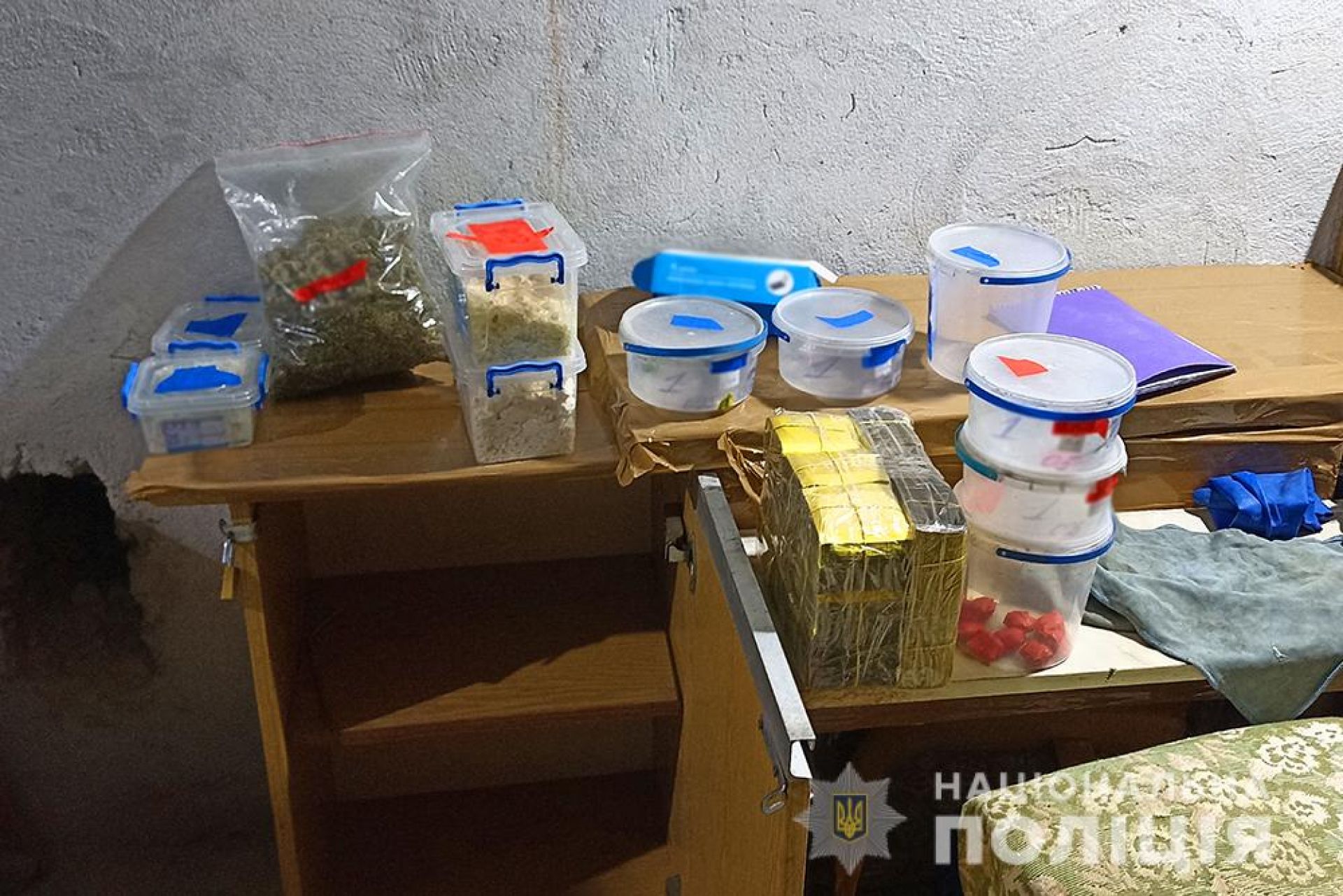 Під час невідкладного обшуку в орендованому дилером гаражі поліцейські виявили пластикові ємності з психотропними речовинами «Альфа-PVP» та амфетамін, загальною вагою близько кілограма, а також півкілограмовий поліетиленовий пакет з канабісом. Крім того, вилучено вже розфасовані у «закладки» канабіс та «Альфа-PVP», пакувальні матеріали, ваги та «чорнові» записи.