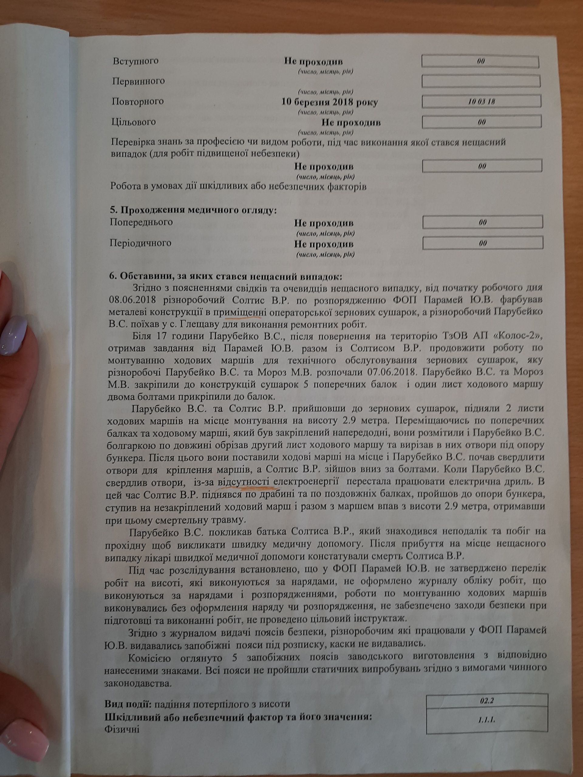 Мати Андрія Михасика, каже адвокат, звернулась до нього майже через рік після трагедії. Коли юрист отримав доступ до матеріалів справи, виявилось, що акт про нещасний випадок оформлено майже через рік після трагедії. Вже після того, як на цьому ж підприємстві загинув Володимир Солтис. До речі, останній свідчив, коли загинув його колега. Невдовзі загинув сам – при схожих обставинах.