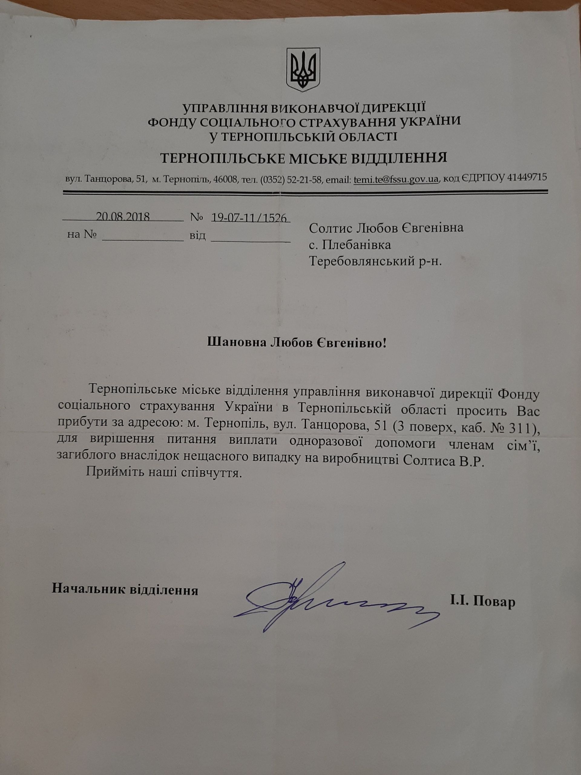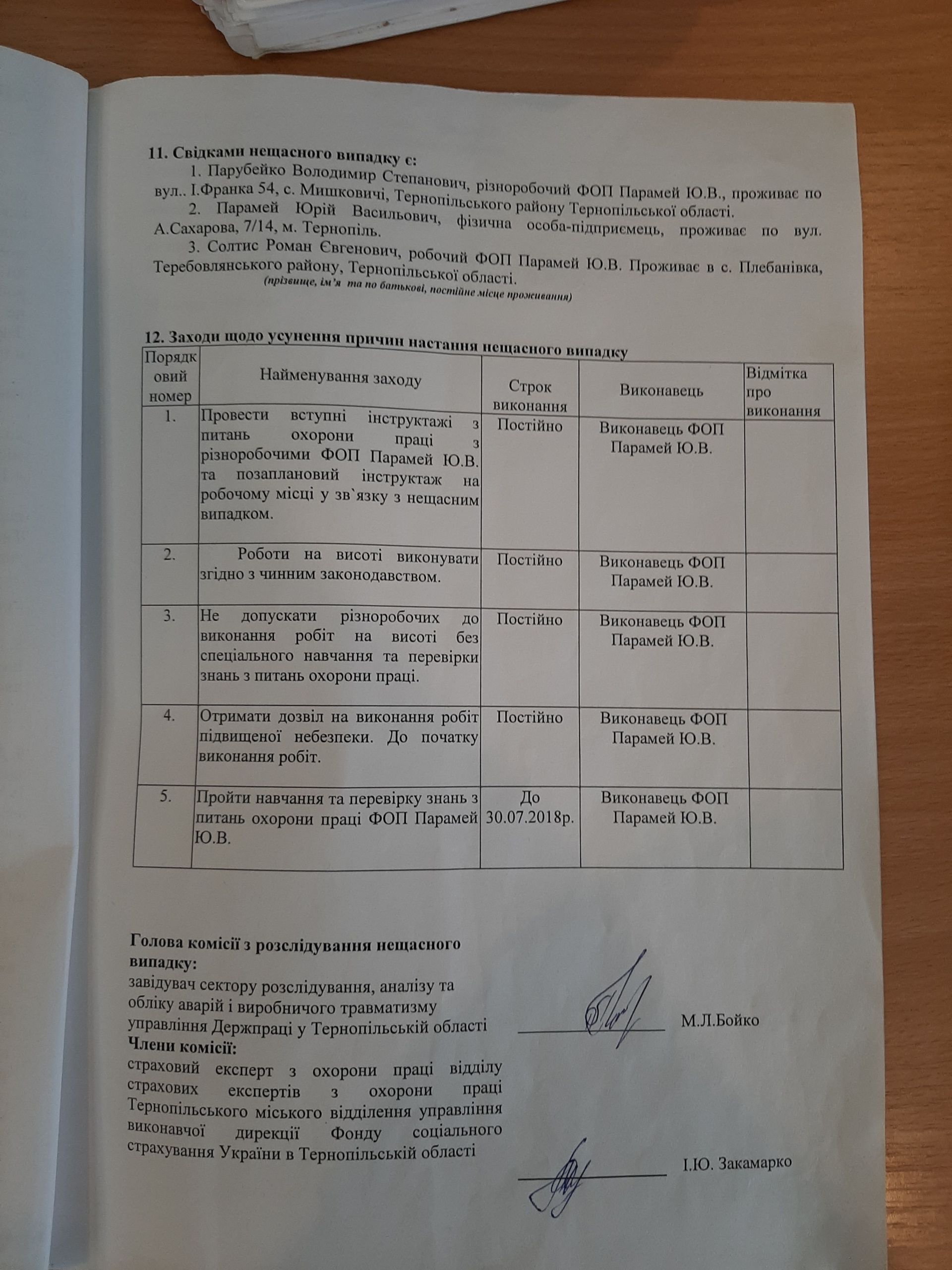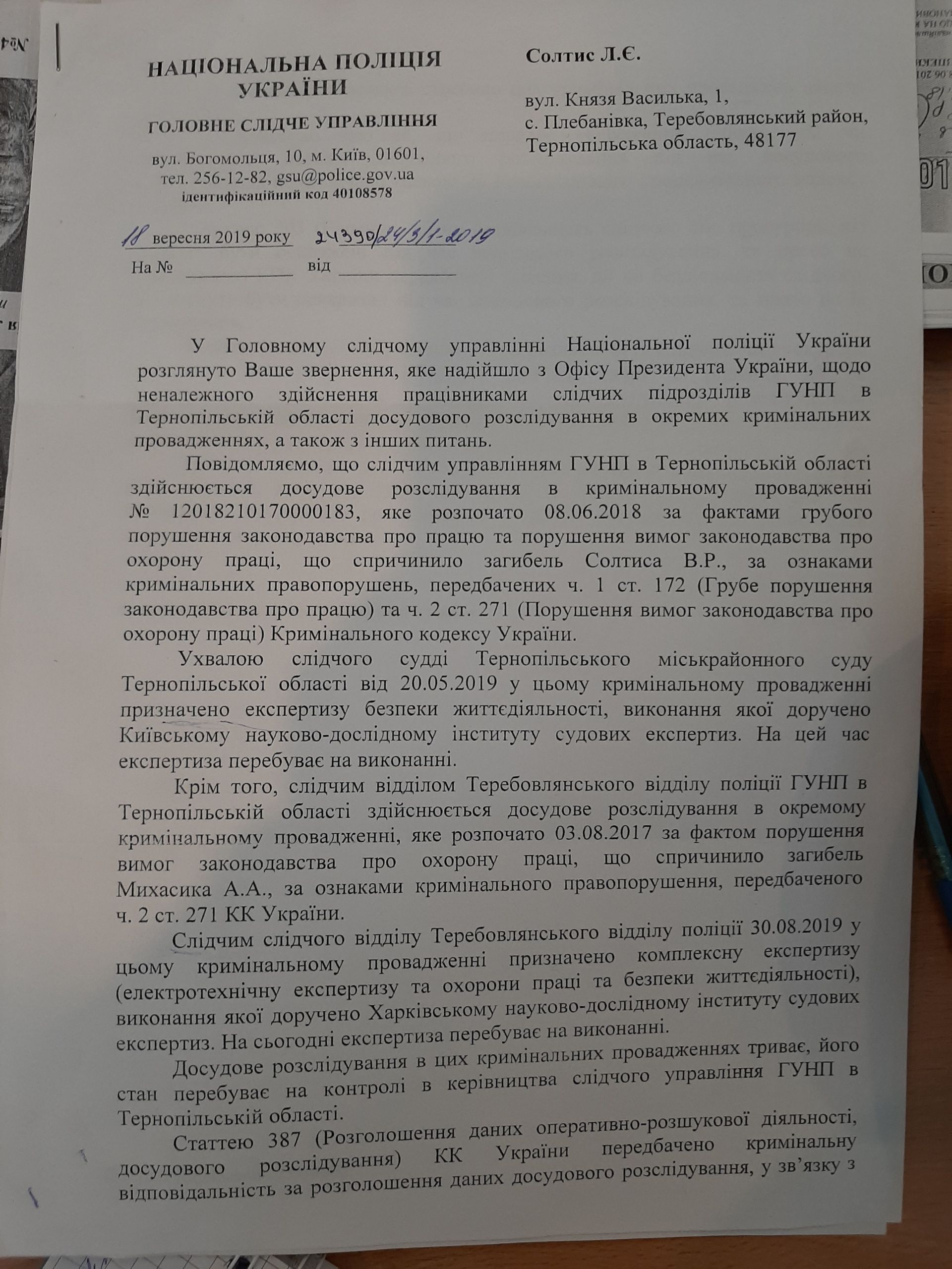 - Коли загинув мій син, ми звернулись в управління праці, щоб дали висновки актів обстеження території, - пригадує Любов Солтис. - У той час актів обстеження території, де загинув Андрій, не було. 17 червня в Теребовлянській поліції з’являються висновки з управління праці. Кого і що приховували?