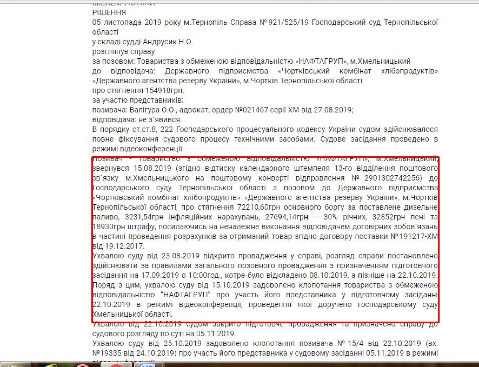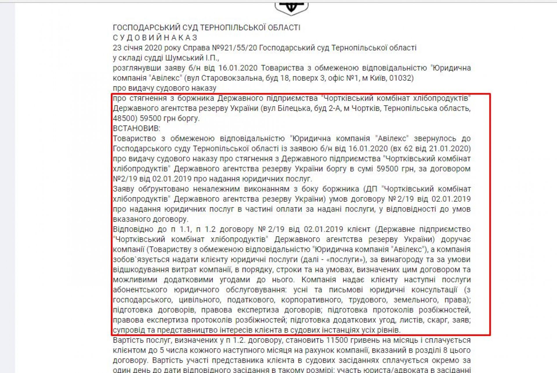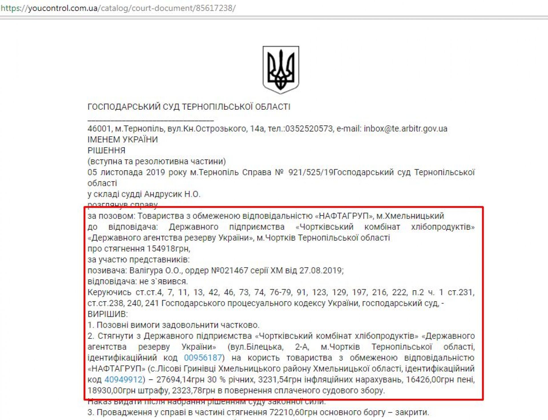 За даними youcontrol, Державне підприємство «Чортківський комбінат хлібопродуктів Держагентства резерву України очолює Денис Мартиненко. Статутний капітал - 4 255 500,00 грн. Основний вид діяльності - виробництво продуктів борошномельно-круп’яної промисловості. У судовому реєстрі – понад 30 документів, що стосуються підприємства. До них позивались різні структури про стягнення боргів.