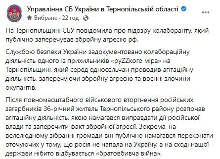 Служба безпеки України задокументовала колабораційну діяльність одного із прихильників «руZZкого міра» на Тернопільщині, який серед односельчан проводив агітаційну діяльність, заперечуючи збройну агресію та воєнні злочини окупантів.