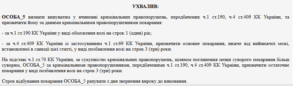 Дослідивши всі обставили суд ухвалив визнати чоловіка винним за обома статтями Кримінального кодексу і призначити остаточне покарання — позбавлення волі на строк три роки.