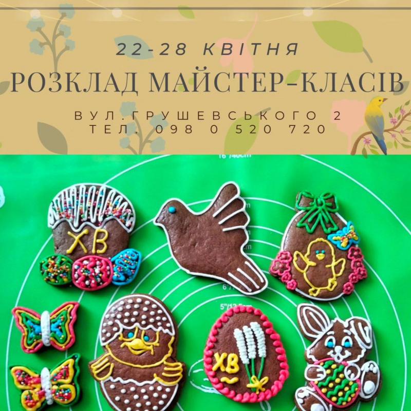 12:30 — 14:30 майстер-клас з декорування великодніх медово-імбирних пряників та розпису великодніх топерів.