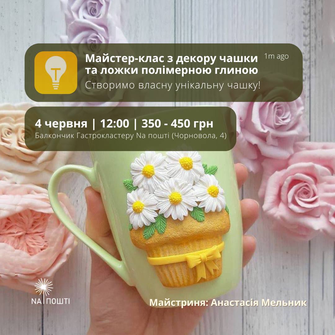 Матимете шанс прикрасити посуд полімерною глиною з майстринею Анастасією Мельник. Кількість місць обмежена. Триватиме майстер-клас 2 години. Всі матеріали входять у ціну (і чашки також).