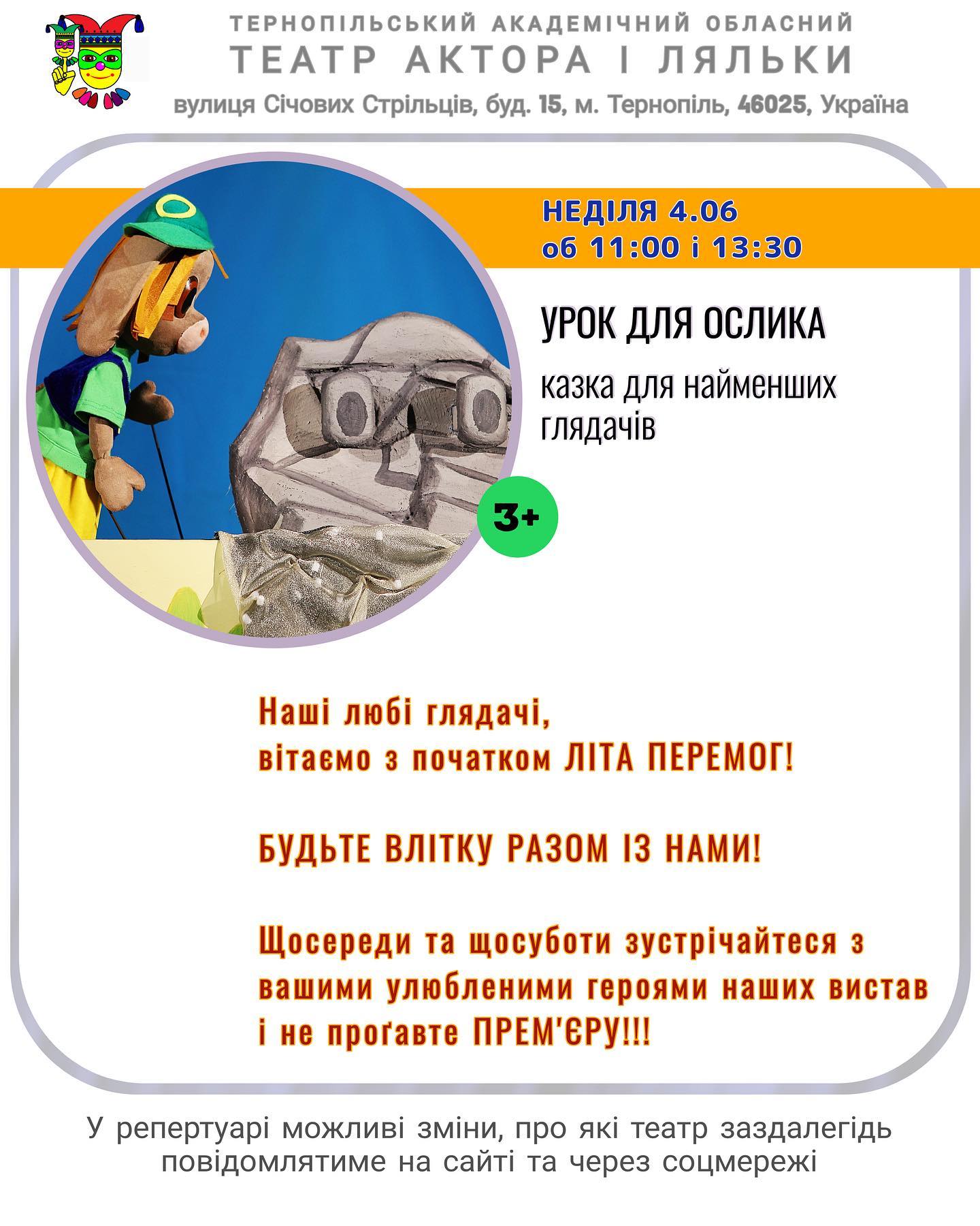 Час і локація: початок об 11:00, тоді – о 13:30, тривалість – 30 хвилин, Тернопільський академічний обласний театр актора і ляльки.
