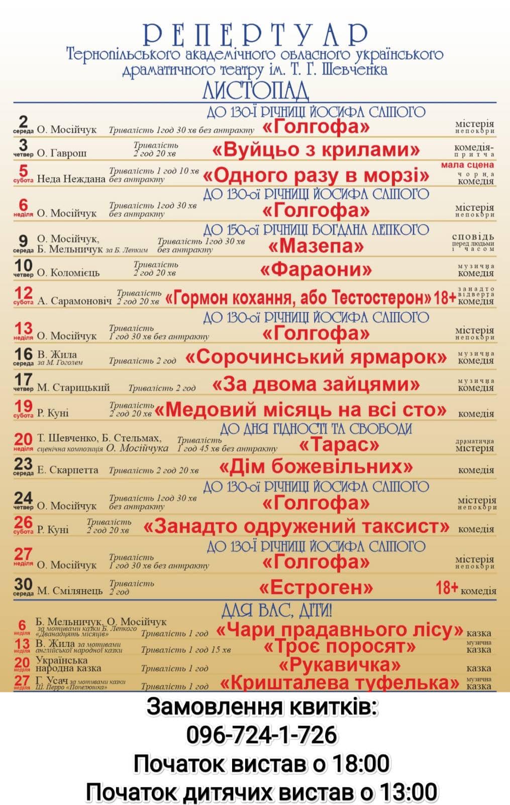 Початок вистав о 18:00 год. Початок дитячих вистав о 13:00 год.