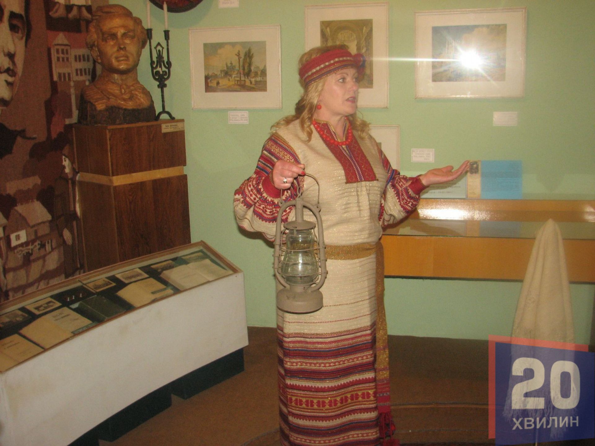 Ольга Карпюк із ліхтарем в руках розповіла про відвідини Тарасом Шевченком Вишнівецького замку та його пригоди в гостині польських панів.